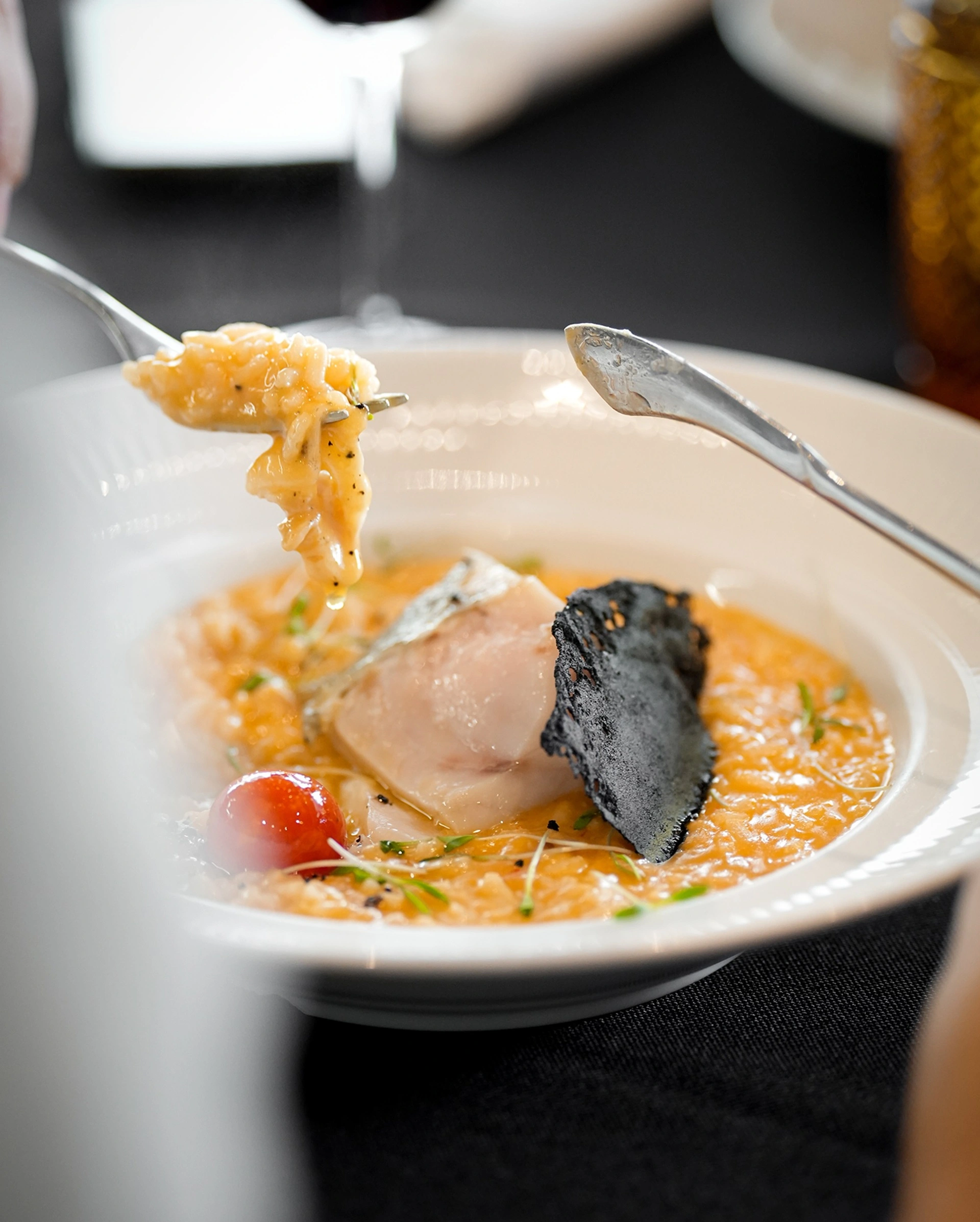 Nas entradas temos presunto de porco ibérico laminado, impossível recusar. Estamos no seio da actividade bacalhoeira de outrora, pelo que os sames - ou samos - fritos com aioli vêm mesmo a calhar. Trata-se da bexiga natatória do bacalhau, rica em colagénio e que se integra bem numa diversidade de pratos. Há croquetes de leitão servidos com maionese de alho assado, maravilhosos, faz-se um bom ceviche com abacate e caju tostado. O pica pau de atum, com mostarda e picles caseiros é muito bom pede bom vinho branco, a garrafeira da casa é copiosa. Escolha não falta.