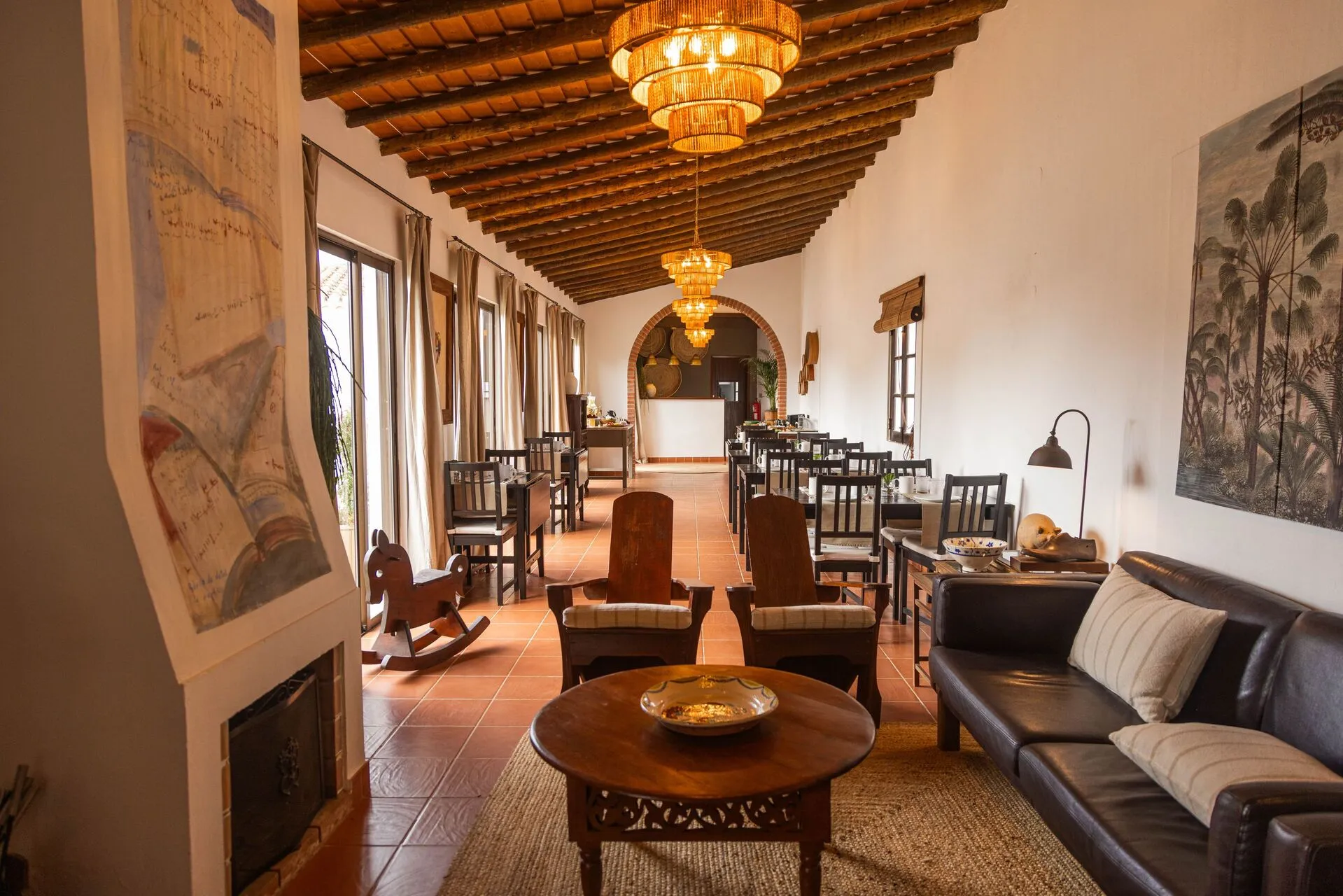 O tamanho da propriedade confere uma vivência familiar ao alojamento. No edifício do check-in servem-se também os pequenos-almoços (com pão alentejano, queijos, enchidos, doces, frutas e tudo o que apetece comer de manhã), e funciona, ao fundo, um bar honesto, onde os clientes podem tomar livremente uma bebida, tomando nota do consumo e liquidando a conta na saída. No outro braço da casa, em formato de L, encontram-se os cinco quartos duplos (com cama de casal ou gémeas), equipados com minifrigorífico, máquina de café, chaleira e ar condicionado.