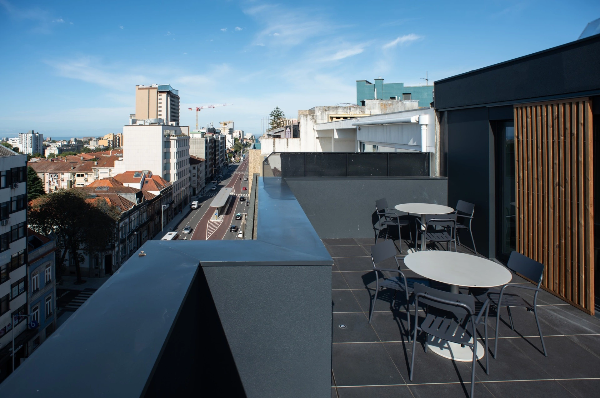 É, aliás, no terraço, que a cidade adquire novas dimensões: com o rumor urbano como pano de fundo, a avenida estende-se por entre telhados e pisos superiores, alcançando, ao fundo, o oceano.