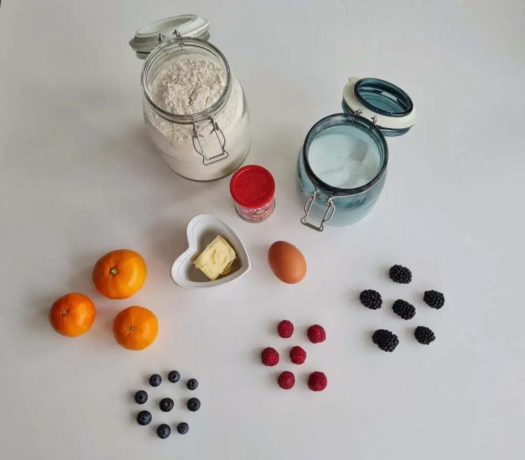 - Divide a mistura em seis forminhas untadas e distribui os mirtilos, framboesas e amoras igualmente por todas.