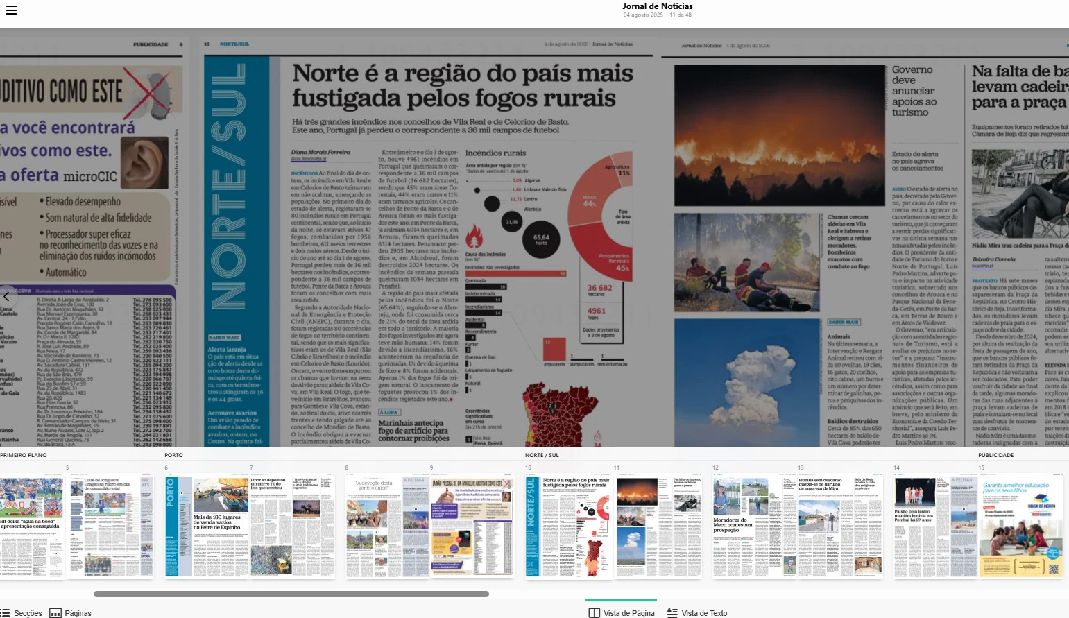 Além da nova app, o "Jornal de Notícias" tem também uma nova versão do jornal em formato digital. É como folhear a edição em papel, mas no smartphone ou no computador, mantendo a paginação, as fotografias, os títulos e todo o grafismo que fazem parte da experiência de leitura do JN.Basta escolher a edição do dia, fazer zoom para ver melhor cada detalhe ou deslizar com o dedo para mudar de página. Para quem prefere uma leitura mais prática, há também um modo especial que mostra apenas o texto do artigo, facilitando a leitura no ecrã. Além disso, é possível guardar páginas ou edições inteiras para ler mais tarde, mesmo sem internet.