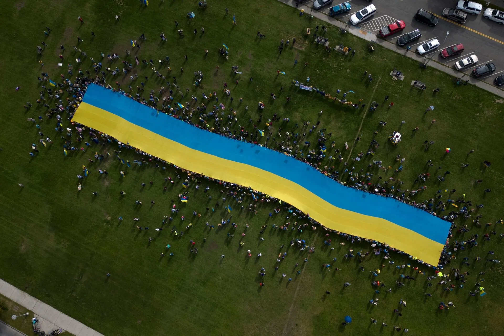 Bandeira gigante da Ucrânia em Anchorage numa manifestação de apoio durante a cimeira Putin-Trump