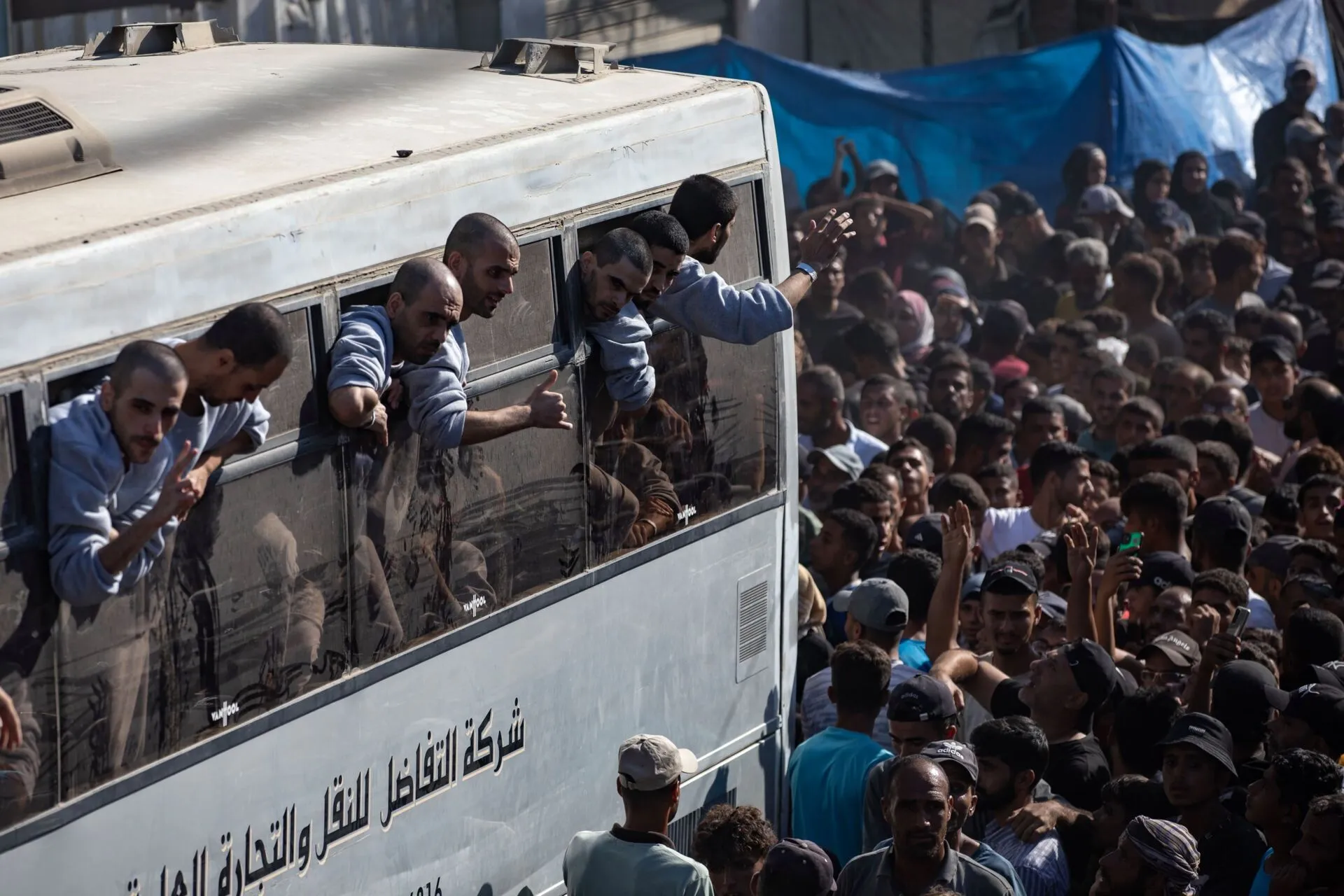 Milhares de pessoas esperavam hoje em frente ao Hospital Nasser, na cidade de Khan Yunis, no sul da Faixa de Gaza, a chegada de autocarros com prisioneiros, que entraram no enclave através da passagem de Kerem Shalom, no extremo sudeste de Gaza.