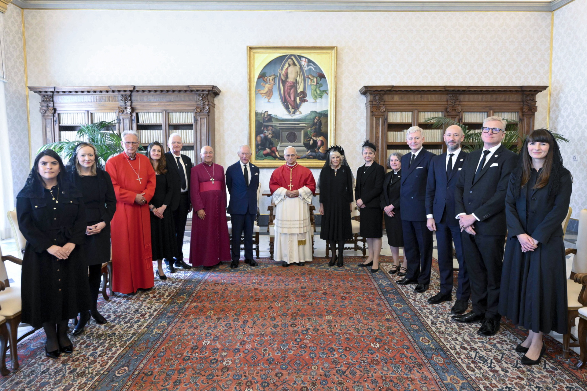 À chegada, a área em redor do Vaticano estava blindada, com reforço de segurança e cães farejadores de explosivos. O casal real atravessou a Praça de São Pedro e foi recebido pelo regente da Prefeitura da Casa Pontifícia, monsenhor Leonardo Sapienza, antes de ser apresentado na biblioteca do Palácio Apostólico. Camila chamou a atenção pelo seu vestido negro de seda, mantilha e um tocado em forma de coroa com folhas negras, acompanhado de um alfinete em forma de cruz que pertenceu a Isabel II. Como rainha anglicana, seguiu a tradição de se apresentar de preto perante o Papa, sendo que apenas monarcas católicos podem vestir branco.