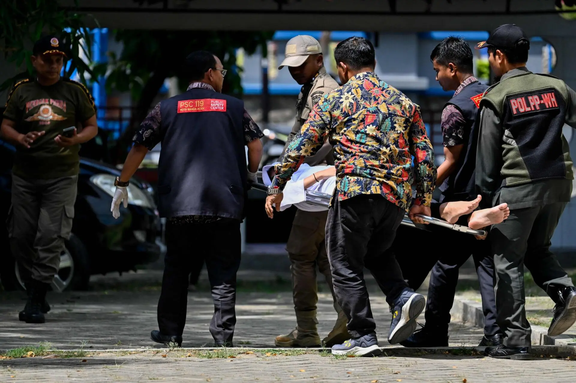A mulher desmaiou depois de ser açoitada e foi levada para o hospital por uma ambulância.