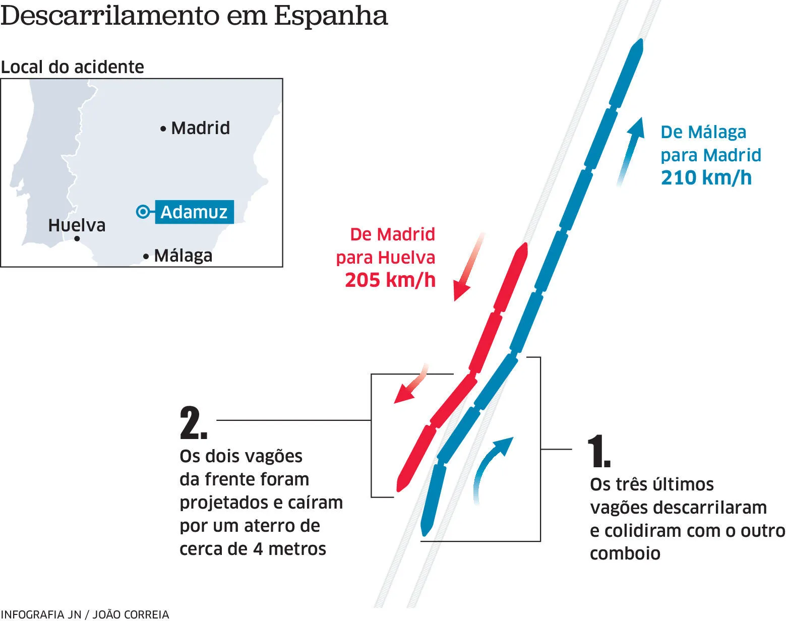 Os últimos três vagões de um comboio que viajava de Málaga para Madrid, ao início da noite de domingo, descarrilaram e invadiram a via contígua, pela qual circulava um comboio com destino a Huelva, que também descarrilou e cujos dois primeiros vagões caíram por um aterro de quatro metros. Pelo menos 40 pessoas morreram no acidente, ocorrido no município de Adamuz, em Córdova, e mais de 150 pessoas (41 continuam internadas), incluindo menores. A investigação aponta para uma falha numa junta na via.