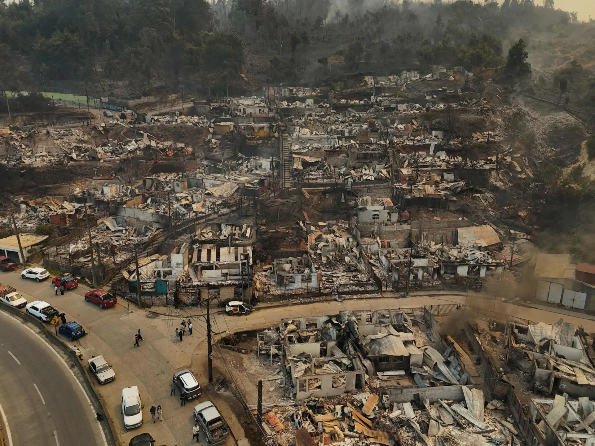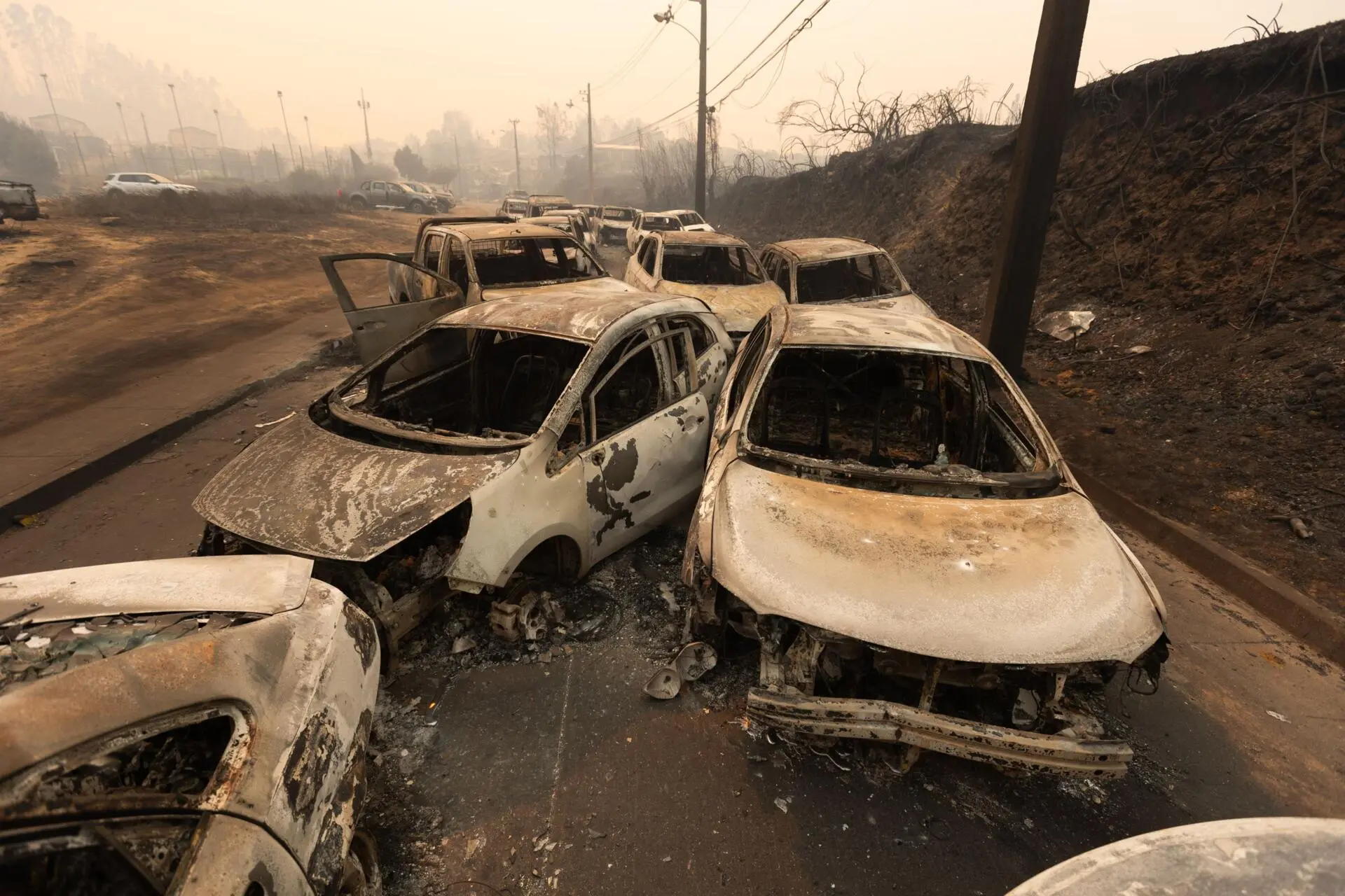 Os incêndios, alimentados pelas altas temperaturas e ventos fortes, deflagraram no sábado nas regiões de Ñuble e Biobío, a cerca de 500 quilómetros a sul da capital, Santiago.