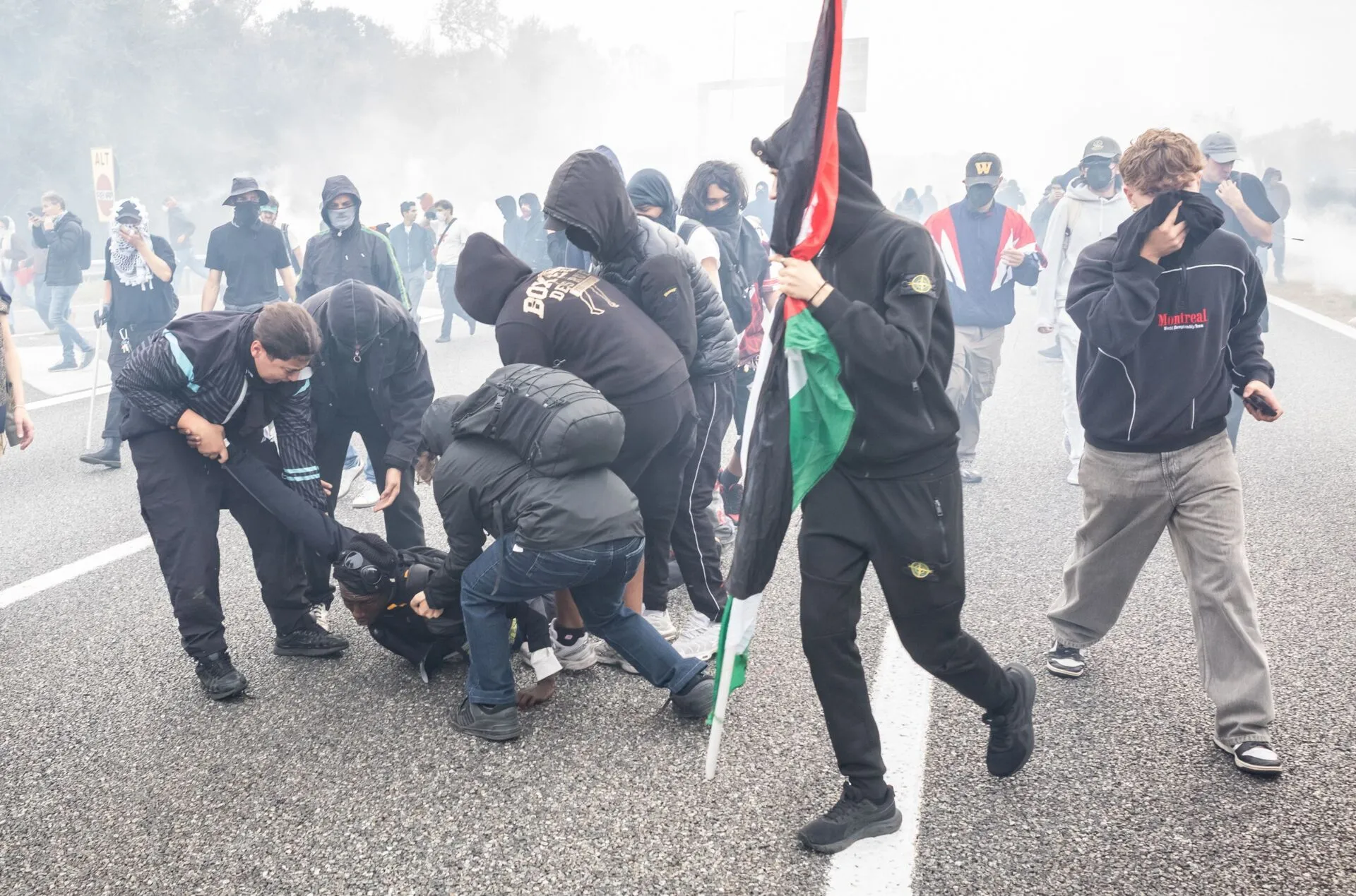 Após a intervenção policial, os protestos intensificaram-se com gritos de "Vergonha, vergonha!" e "Palestina livre", enquanto os participantes se confrontavam com os agentes e continuavam a bloquear a via.
