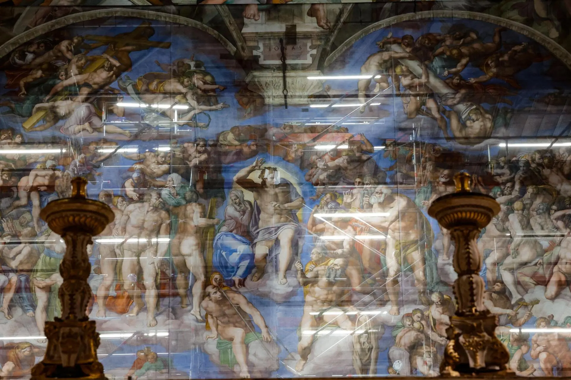 Os visitantes ainda podem entrar na Capela Sistina, no coração do Vaticano, durante o restauro, mas o fresco foi ocultado por um grande andaime coberto com uma reprodução da obra. A diretora dos Museus do Vaticano, Barbara Jatta, descreveu a camada branca que está a ser removida como "um pouco como uma catarata", durante uma visita guiada à imprensa sobre o projeto, que deverá estar concluído antes da Páscoa.