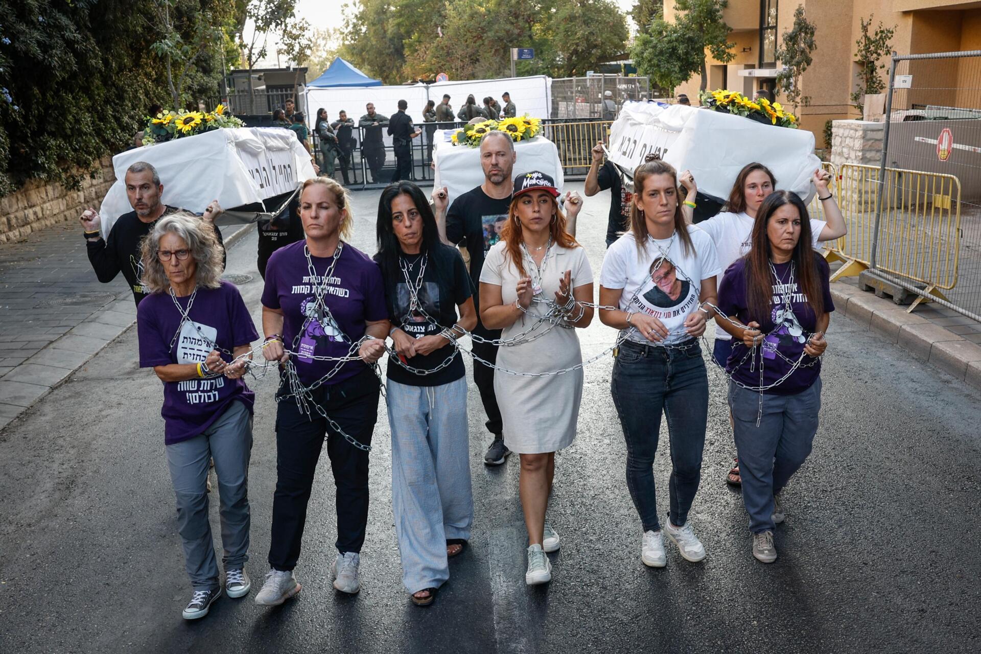 Vigiadas de perto pelas forças de segurança, seis mães juntaram-se à porta do n.º 35 da rua Azza, prenderam-se com correntes metálicas e perfilaram-se junto de três caixões vazios: um para o próximo refém assassinado pelo grupo islamita palestiniano devido à pressão militar de Israel, outro para um refém que desaparecerá num bombardeamento e outro ainda para o soldado seguinte que cairá "na guerra sem propósito" no enclave.