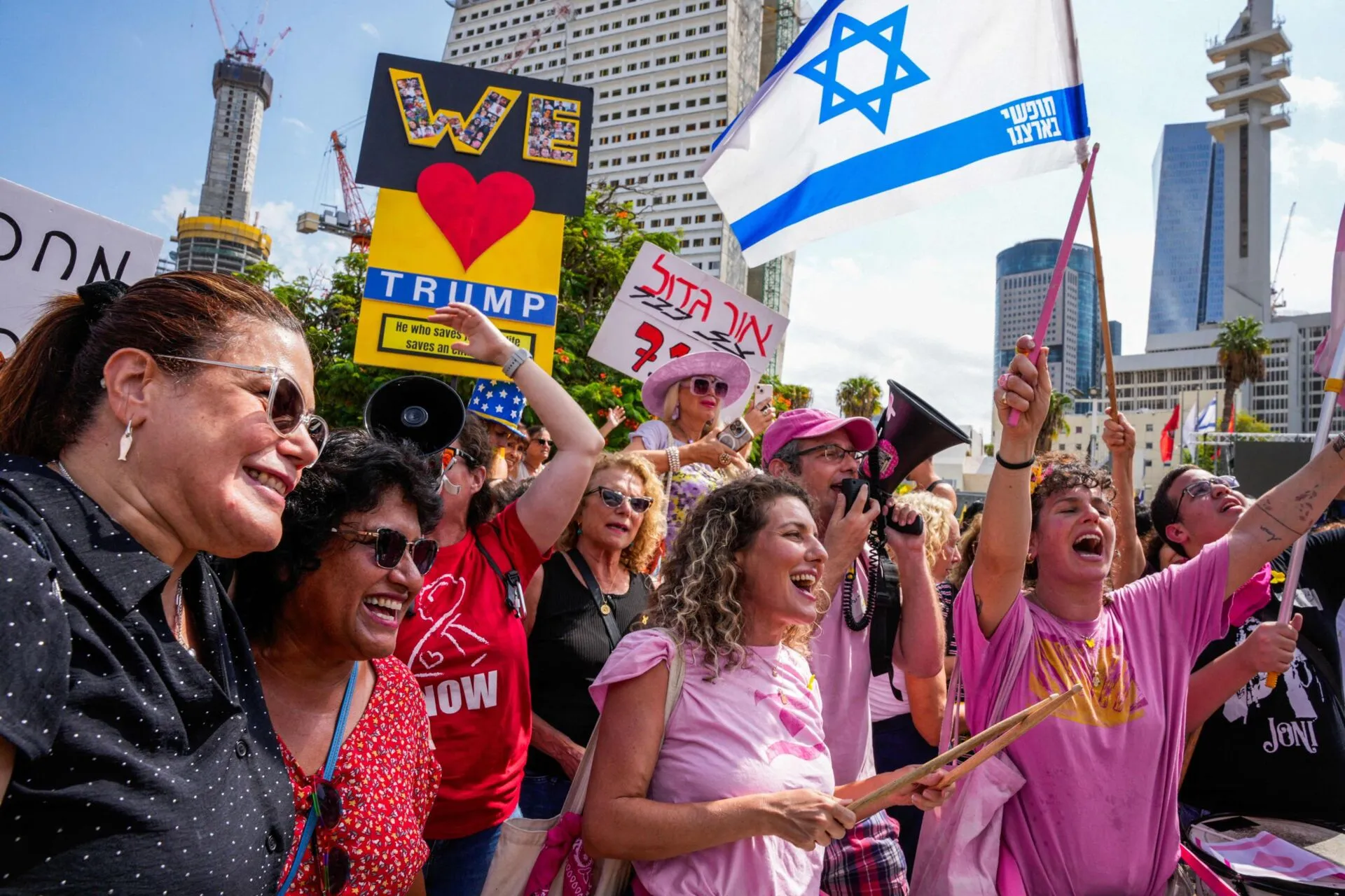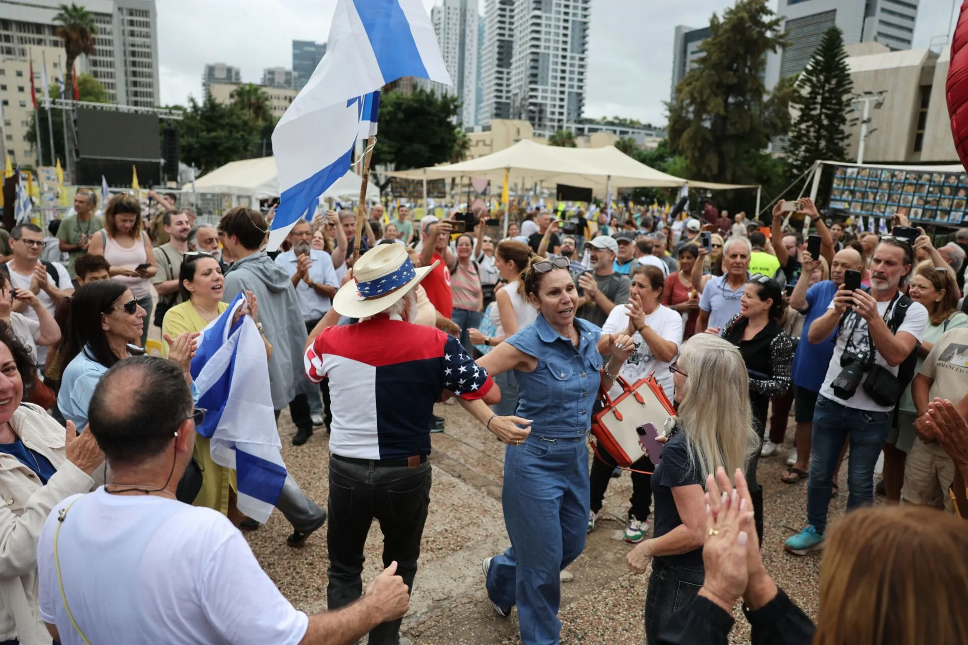 Na praça, muitos exibem autocolantes com a inscrição "Eles estão a voltar", acompanhada de um coração amarelo, evocando a fita amarela que se tornou símbolo dos reféns, havendo Uma mulher mascarada como "Tio Sam" a empunhar um cartaz onde se lia "We love Trump" ("Amamos Trump"), em homenagem a quem apresentou o plano para Gaza e impulsionou as negociações indiretas entre Israel e o Hamas.