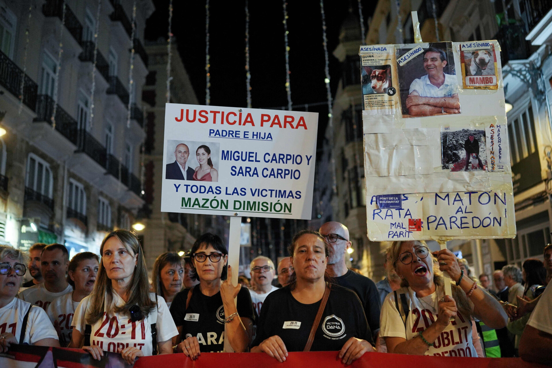 A 12.ª manifestação consecutiva contra Carlos Mazón, convocada por mais de 200 organizações sociais, cívicas e sindicais, começou às 18.30 horas (uma hora a menos em Portugal continental) na Plaza de San Agustín, com palavras de ordem como "Mazón, demite-te" e "O presidente para Picasent", numa referência à prisão que funciona nessa localidade. Familiares das vítimas lideraram o cortejo, precedidos por três tratores, simbolizando a força rural afetada pela tragédia.