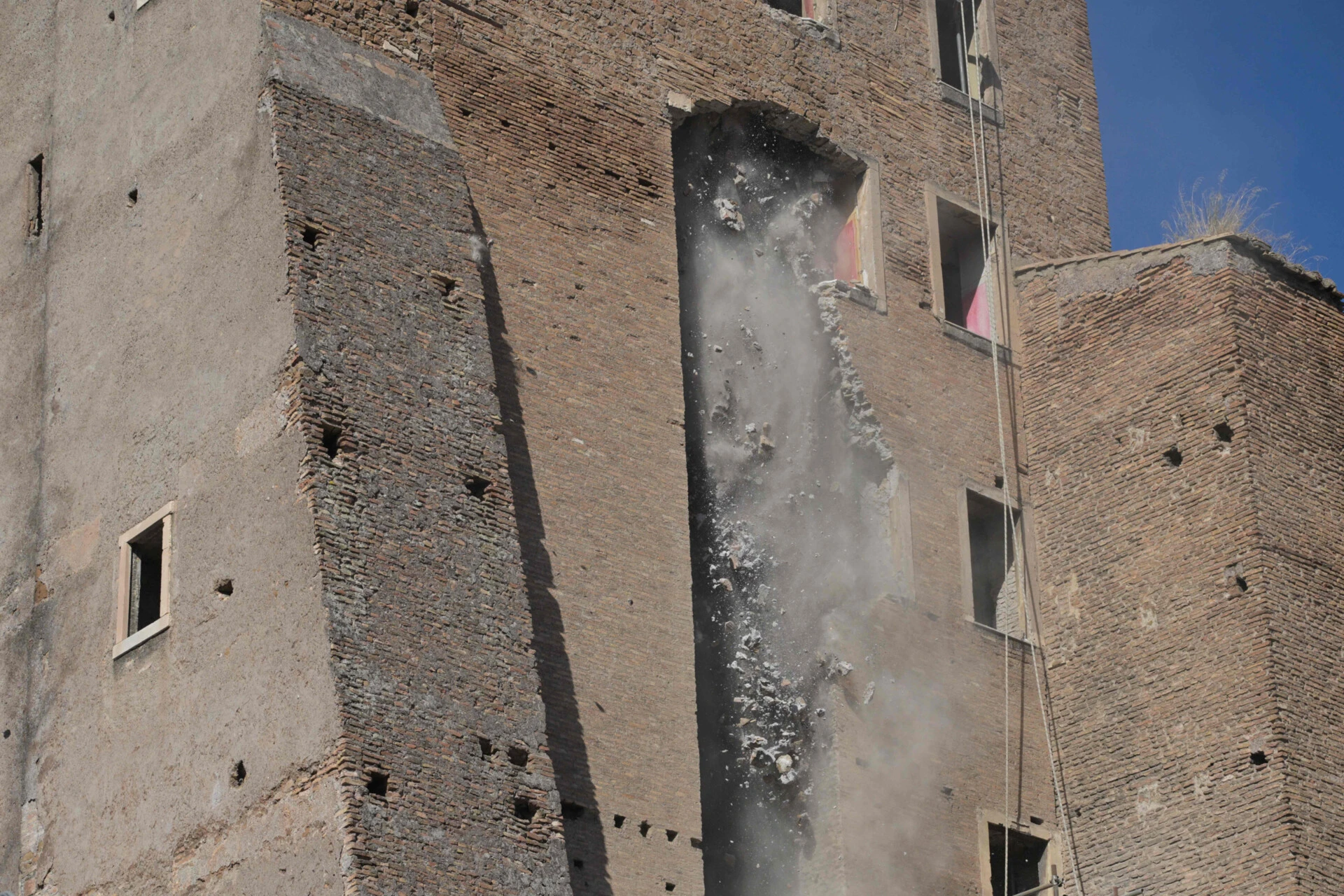 Parte da Torre dei Conti colapsou pouco depois das 11.30 horas, com uma porção da fachada a lançar escombros para a rua e uma densa nuvem de poeira branca para o ar. A torre está numa zona movimentada, perto do Fórum Imperial e do Coliseu, o principal ponto turístico de Itália.