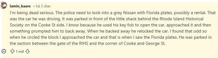 O caso tomou um novo rumo quando uma testemunha disse ter visto o suspeito a abrir um Nissan Sedan cinzento com matrículas da Florida, estacionado atrás da Sociedade Histórica de Rhode Island, próximo ao prédio da Barus & Holley, onde ocorreu o tiroteio. "Estou a falar muito a sério. A polícia precisa de investigar um Nissan cinzento com matrículas da Florida, possivelmente um carro alugado", lê-se.