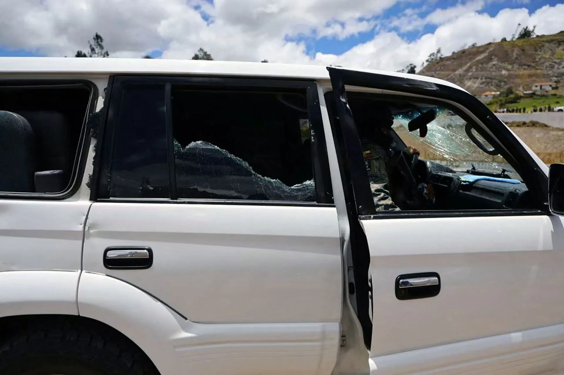 Na rede social X, a Presidência do Equador publicou vídeos que mostram o interior de um dos carros da comitiva presidencial, com vários projéteis a atingirem os vidros.