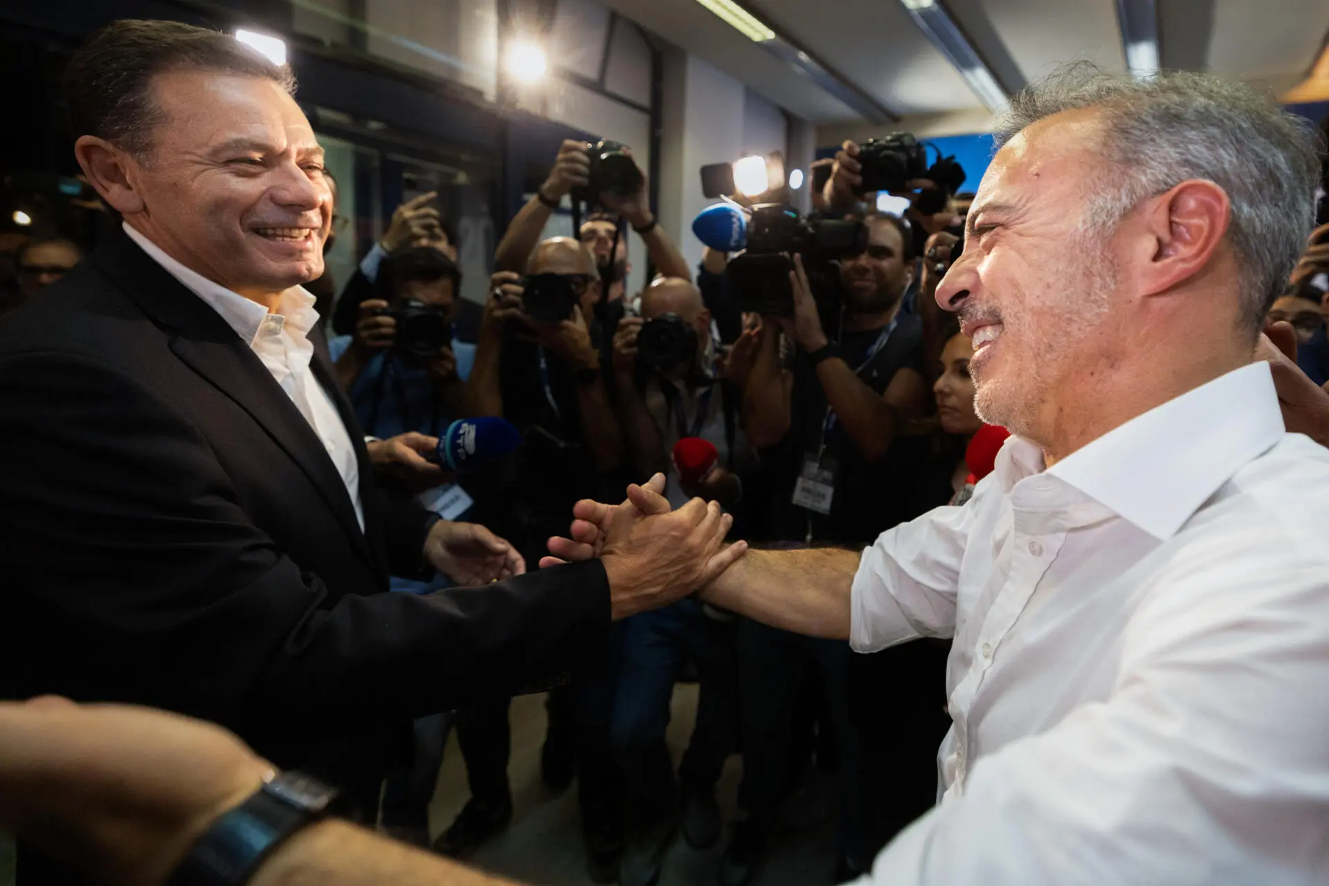 Luís Montenegro felicita Pedro Duarte pela vitória à Câmara Municipal do Porto nas eleições autárquicas de 12 de outubro, na sede de campanha do atual autarca portuense (Foto: Pedro Correia)