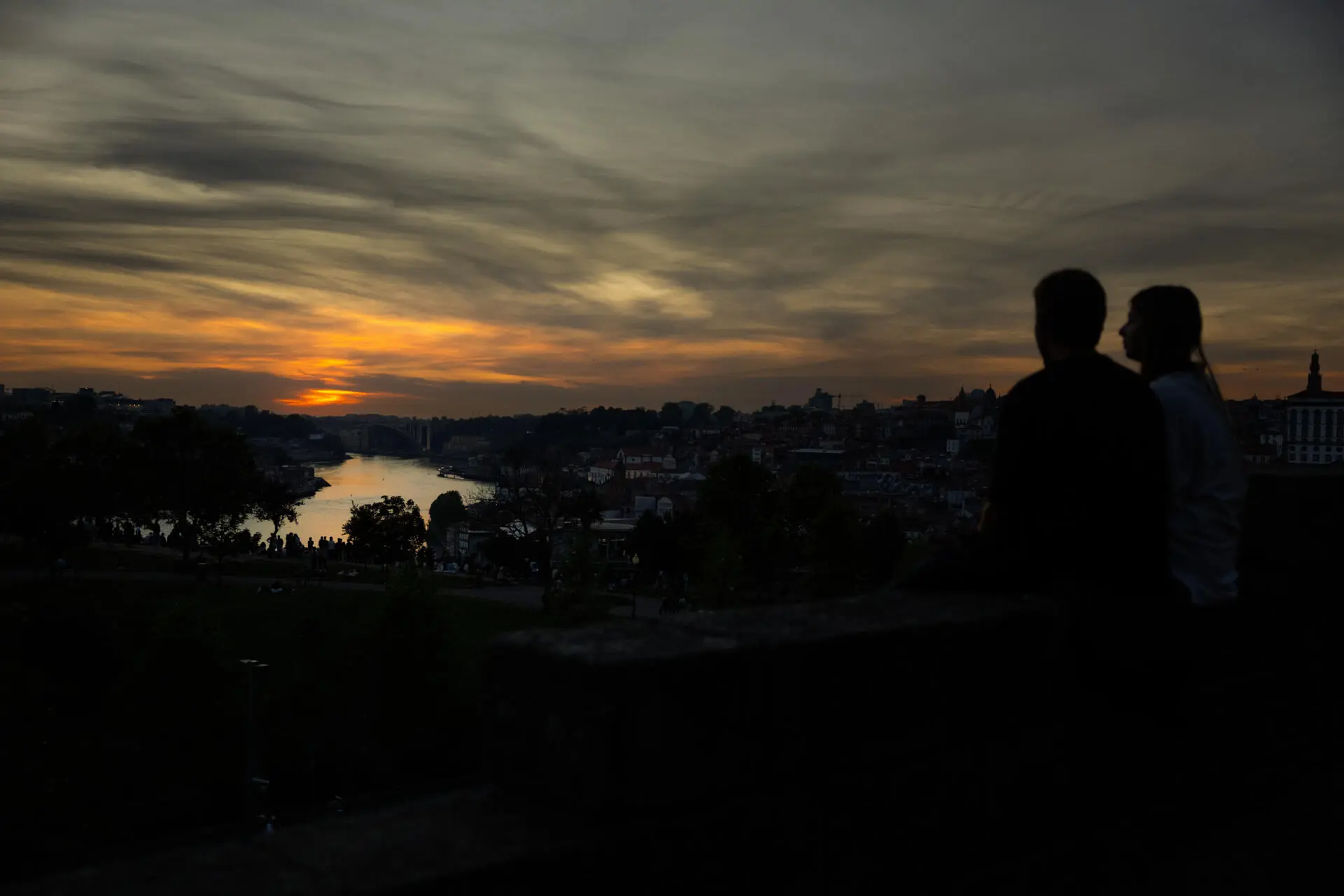 Casal contempla o pôr do sol no Jardim do Morro, em Vila Nova de Gaia, no dia do apagão que atingiu Portugal e Espanha, no dia 28 de abril (Foto: Pedro Correia)