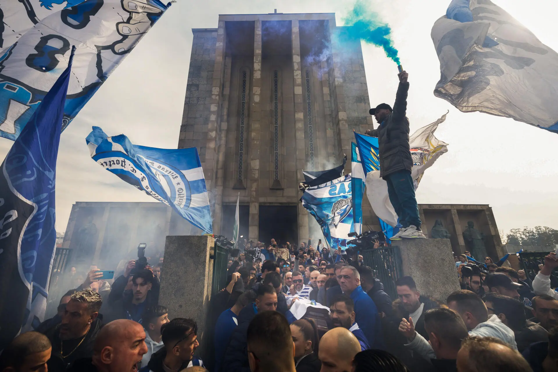 A saída do caixão de Pinto da Costa no dia do funeral da figura ímpar do F. C. Porto e do futebol português, que juntou milhares de adeptos na Igreja das Antas, no Porto, no dia 17 de fevereiro. Elementos dos Super Dragões carregaram a urna (Foto: Pedro Correia)