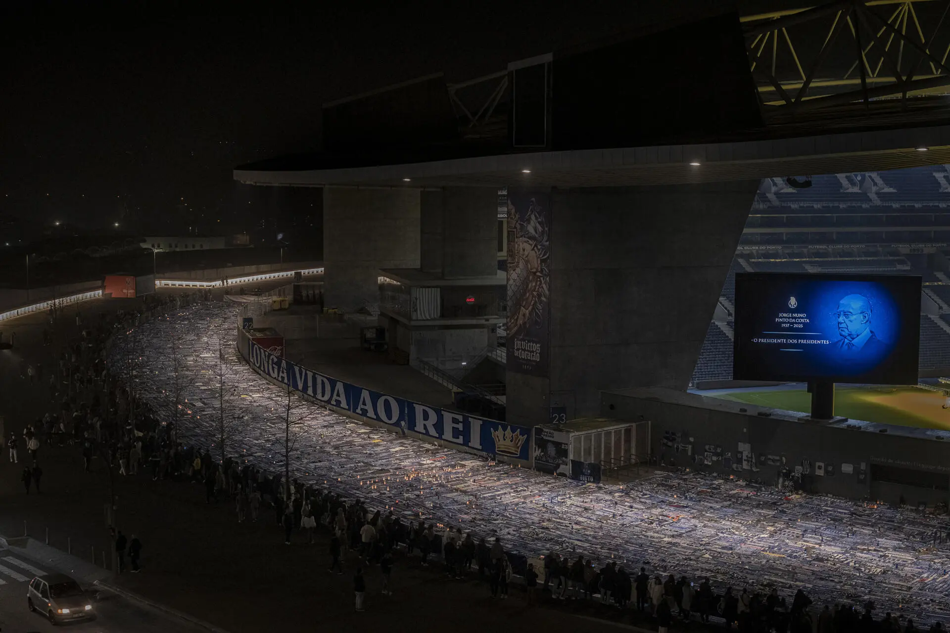 Depois de ser anunciada a morte, em 15 de fevereiro, do histórico presidente do Futebol Clube do Porto, Jorge Nuno Pinto da Costa, os adeptos dirigiram-se ao estádio e deixaram as mais variadas recordações, como cachecóis, bandeiras, fotografias ou camisolas, ao longo da via circundante do edifício (Foto: Leonel de Castro)