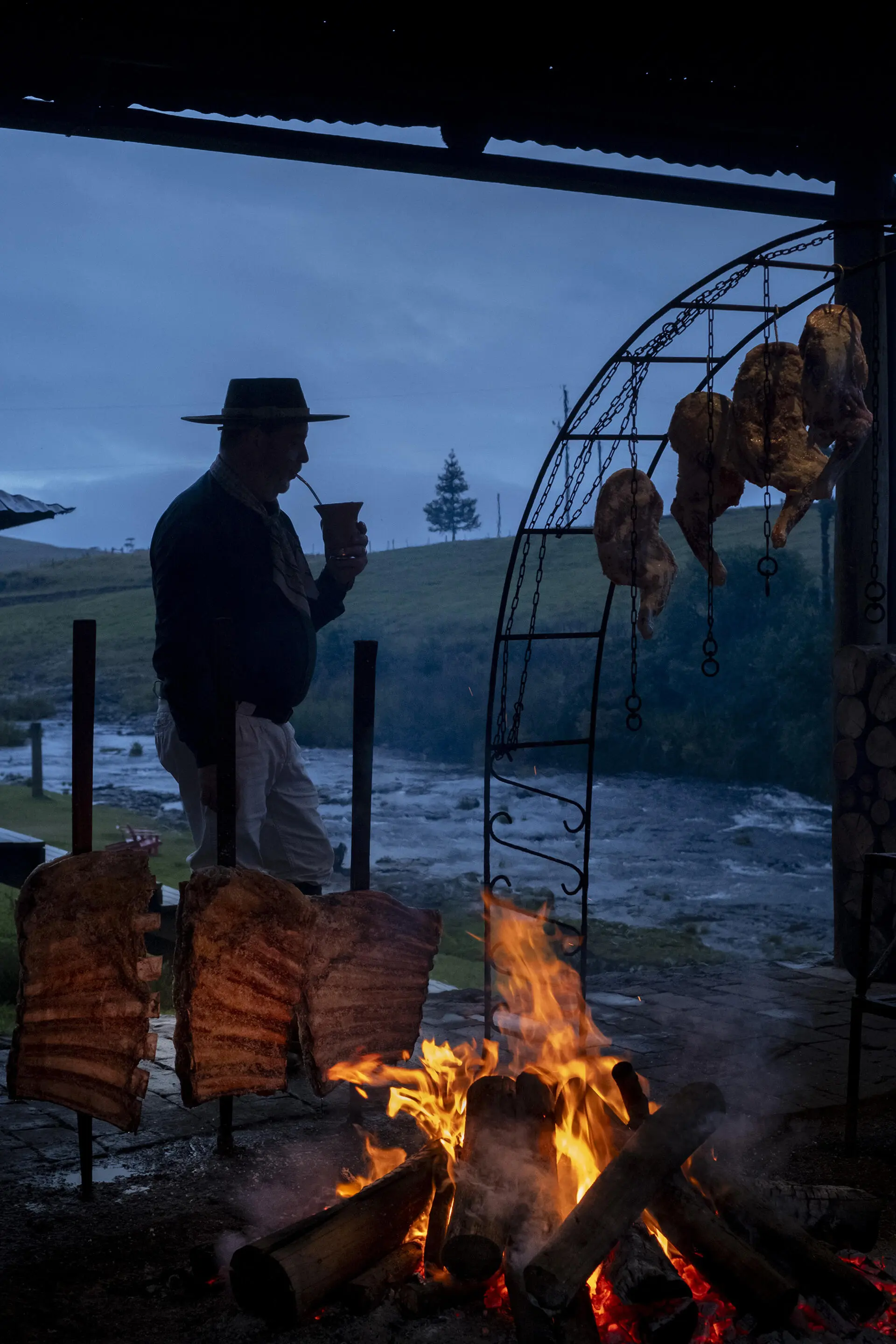 O chef do Hotel Parador, Vladimir Paiva, prepara a prestigiada iguaria gaúcha, carne de vitela no tradicional fogo de chão, no Rio Grande do Sul, em Cambará (Foto: Leonel de Castro)