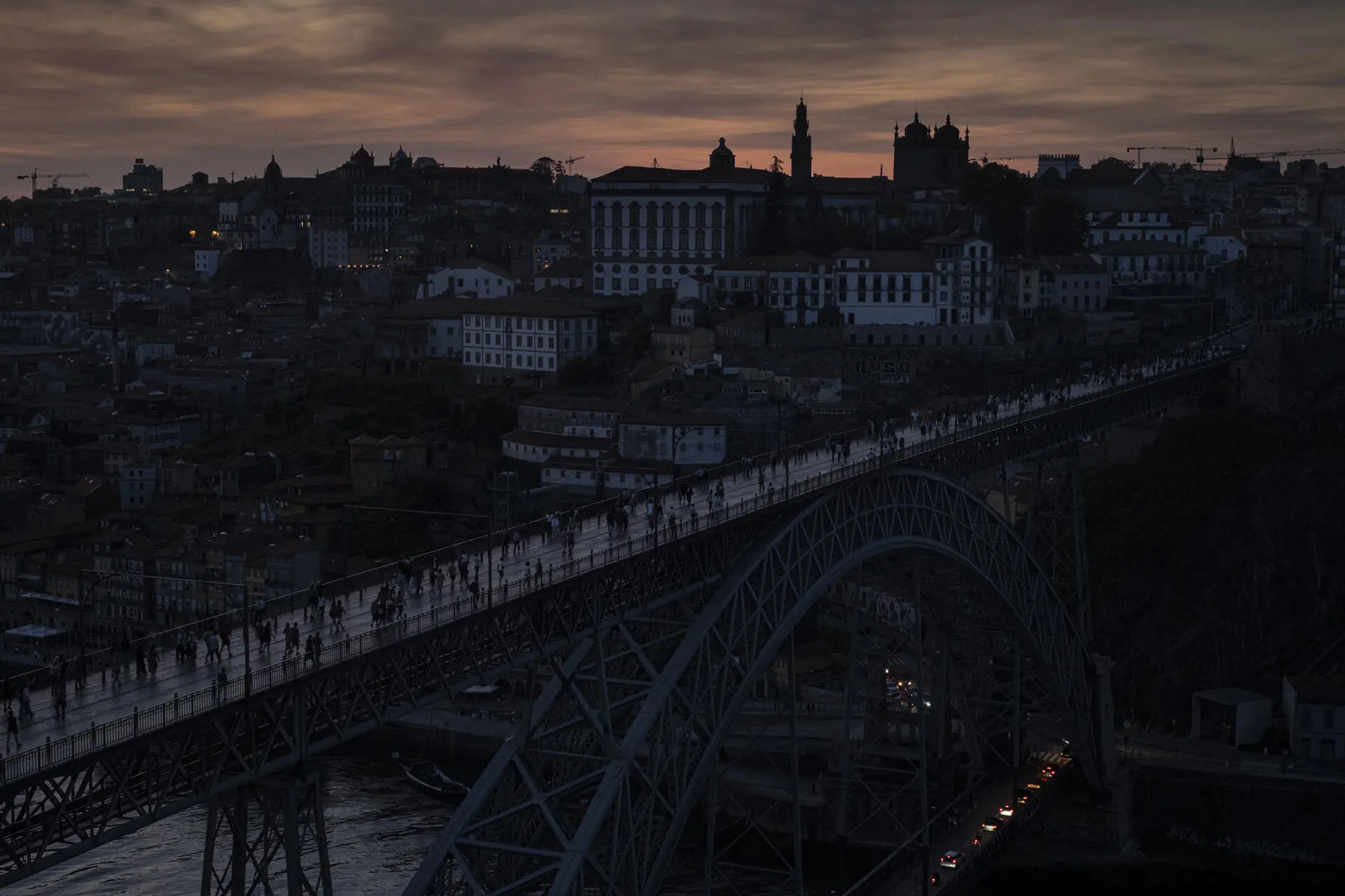 A cidade do Porto não escapou ao apagão ibérico e os poucos pontos de luz que se avistam na imagem são os automóveis que atravessam o tabuleiro inferior da Ponte Luiz I (Foto: Leonel de Castro)