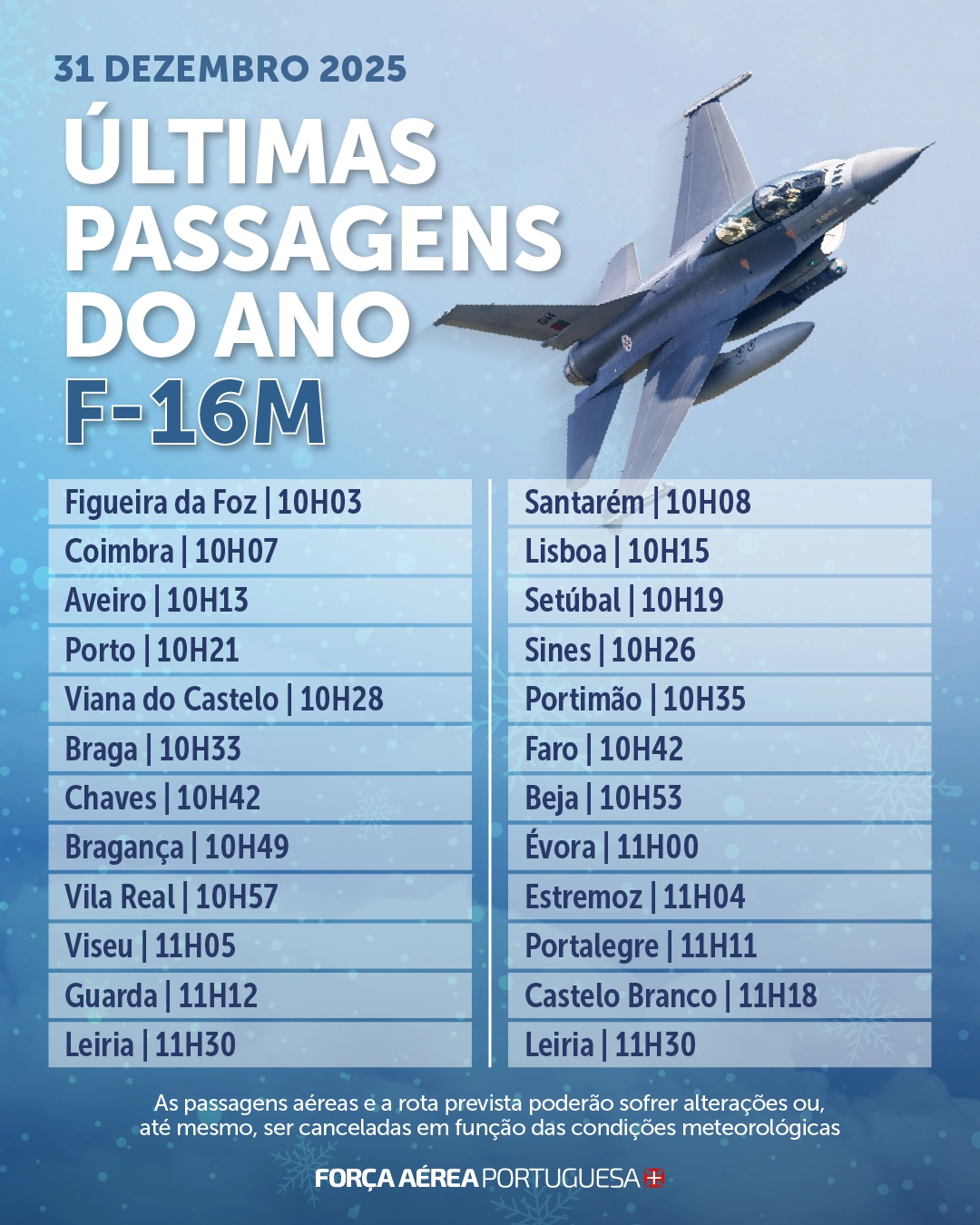 Dois aviões caças F-16M da Força Aérea vão hoje sobrevoar, entre as 10 e as 11.30 horas, várias regiões para desejarem um feliz 2026 a toda a população, aproveitando para realizar as últimas horas de voo de treino deste ano.