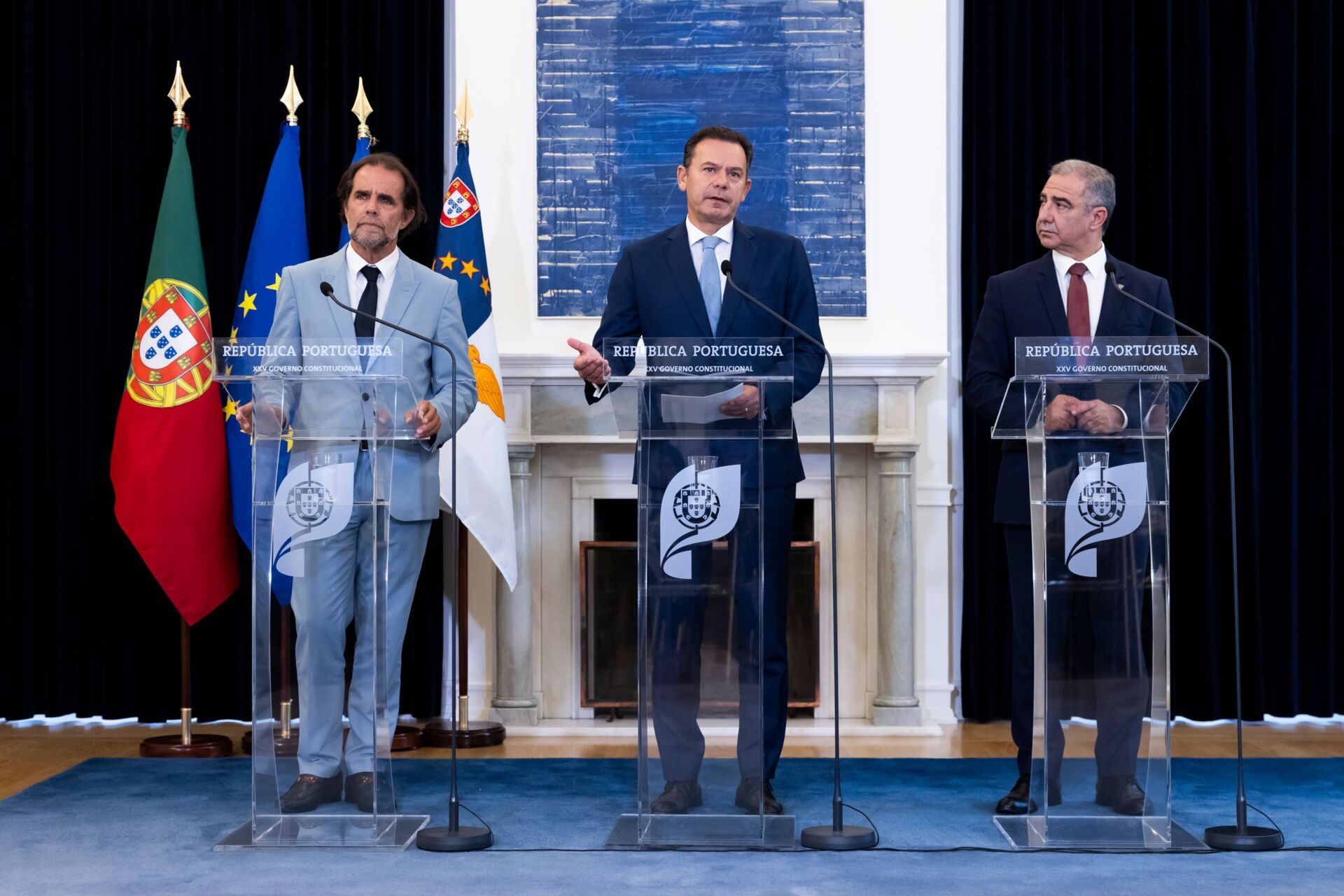 Luís Montenegro fez uma declaração no final da reunião de Conselho de Ministros, que hoje contou, de forma inédita, com a presença dos presidentes das Regiões Autónomas dos Açores, José Manuel Bolieiro, e da Madeira, Miguel Albuquerque, mas nenhum dos três respondeu a perguntas da comunicação social.