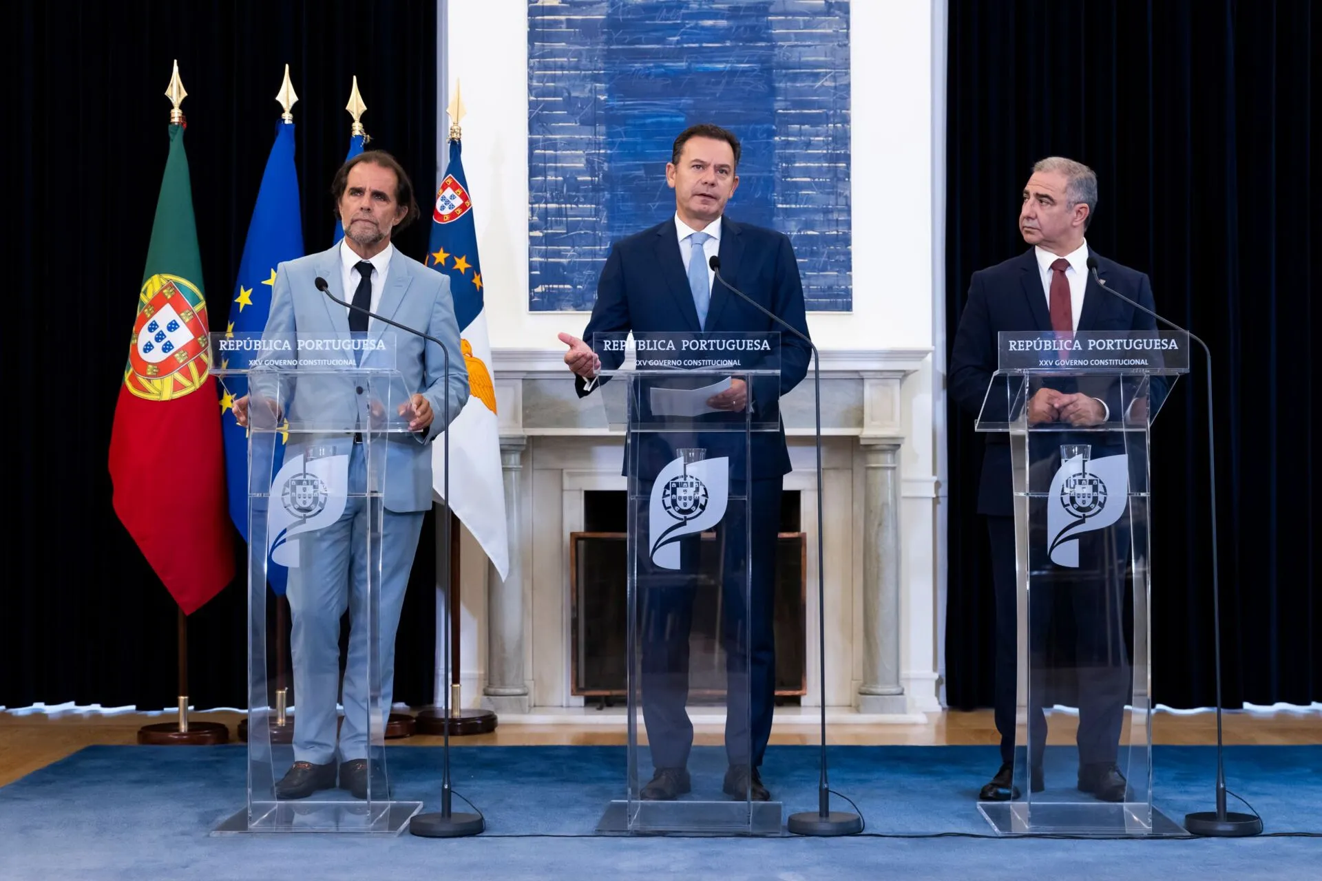 Montenegro ladeado por Miguel Albuquerque (à esquerda) e José Manuel Bolieiro (à direita)