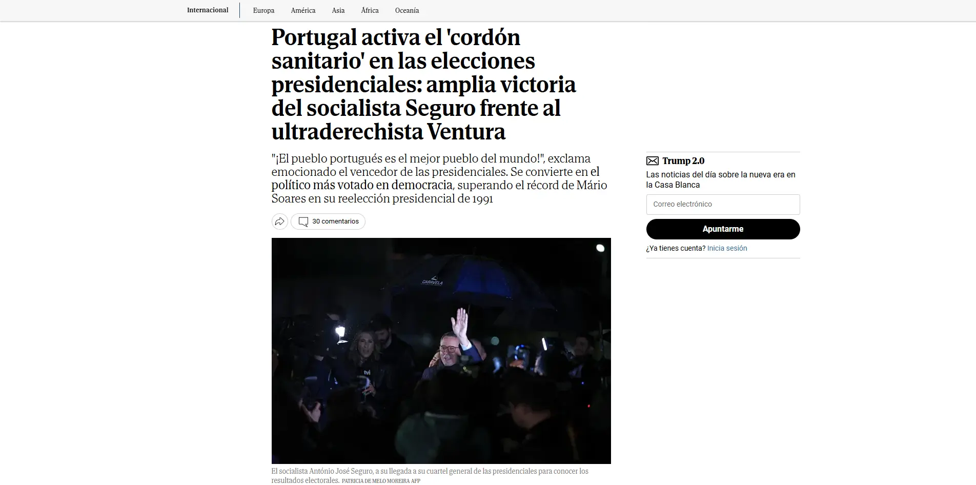 "O socialista António José Seguro derrota nas presidenciais o populista André Ventura. Os portugueses elegeram um moderado, que estava há mais de uma década fora da política, para substituir Marcelo Rebelo de Sousa", escreve o "El País".