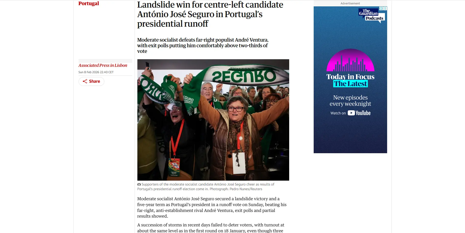 Já o "The Guardian" refere que "o moderado socialista derrotou o populista de extrema-direita André Ventura".