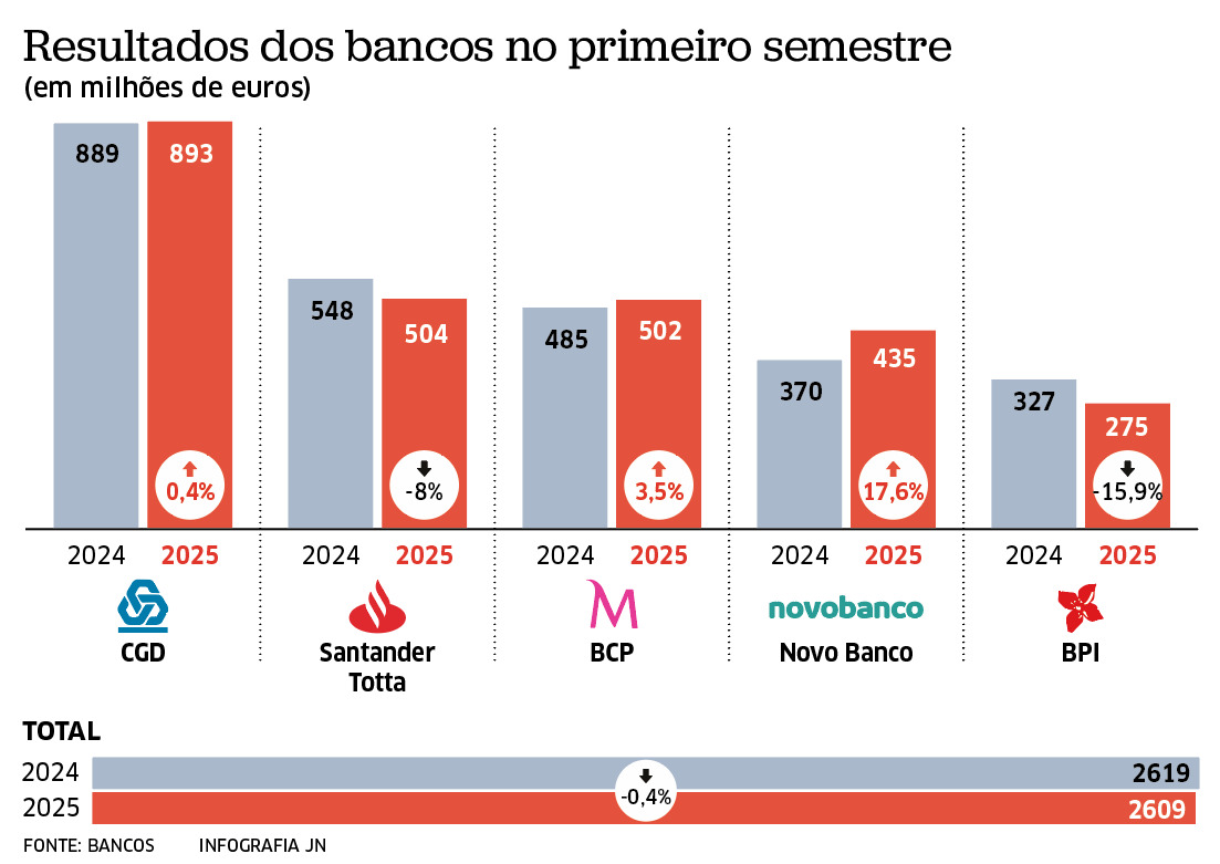 A queda nos resultados líquidos dos cinco maiores bancos a operar em Portugal só não foi maior porque as comissões pagas pelos clientes amorteceram uma parte da perda. No primeiro semestre, foram cobrados 1262 milhões de euros em comissões, num aumento de 29 milhões de euros (2,4%) face aos primeiros seis meses de 2024.