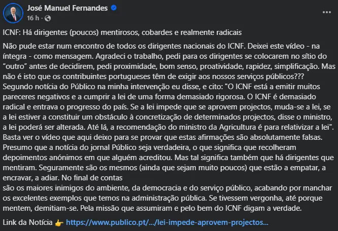 Na apresentação escrita do polémico vídeo, deixada na sua página pessoal no Facebook, José Manuel Fernandes não poupou o ICNF. "As afirmações são absolutamente falsas", acusou.