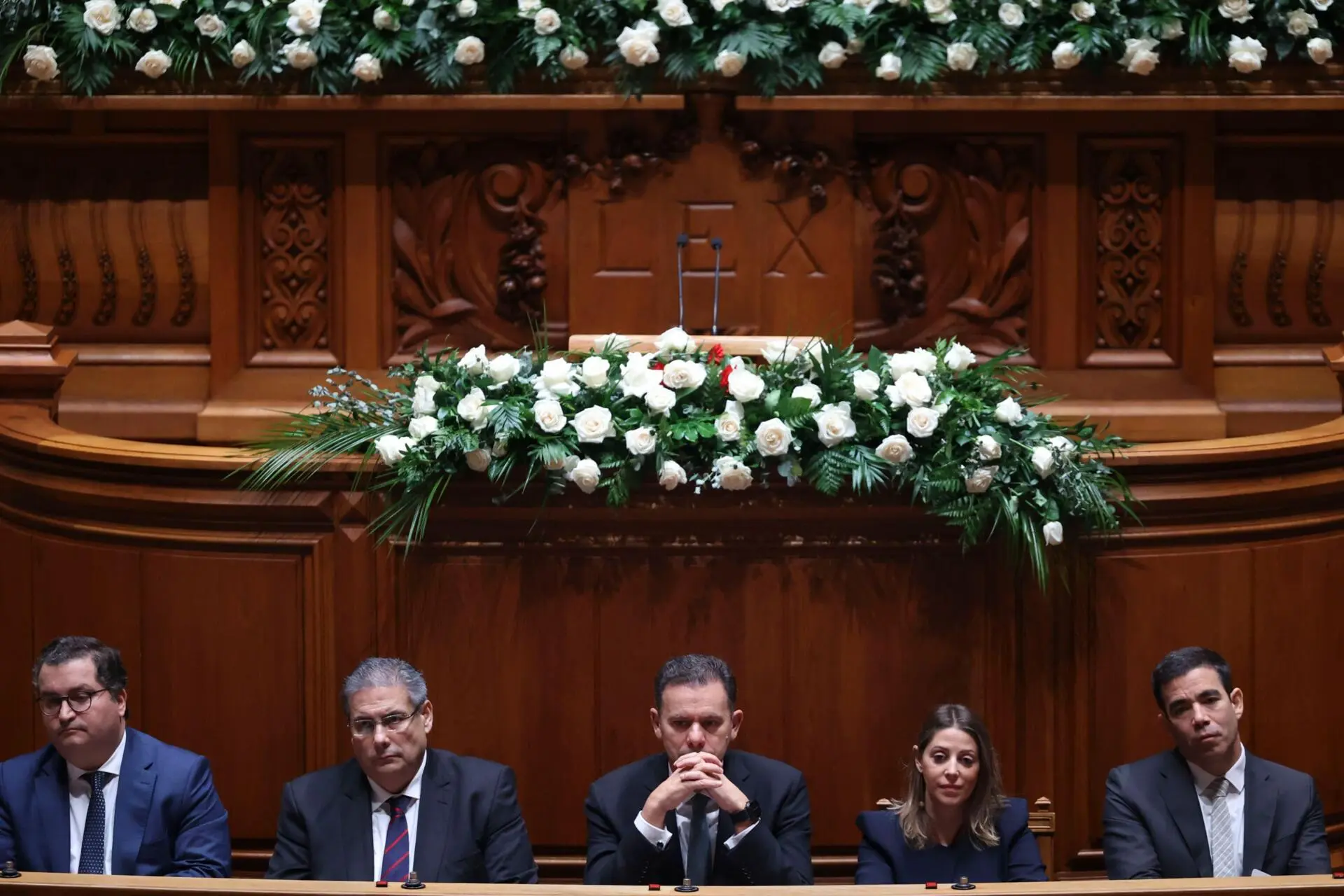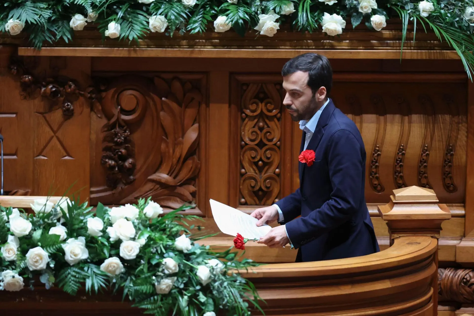 E se a divisão entre os partidos políticos sobre a interpretação do 25 de Novembro foi audível nos discursos, também o foi nas flores. Paulo Núncio (CDS) e André Ventura (Chega) taparam ou retiraram, respetivamente, os cravos vermelhos, símbolo do 25 de Abril, deixados no púlpito por Jorge Pinto (Livre) e por Mariana Mortágua (BE). Todo o Parlamento estava decorado com rosas brancas. Vários deputados do PS usaram cravos vermelhos na lapela. Também Inês Sousa Real do PAN discursou com a flor símbolo do 25 de Abril.
