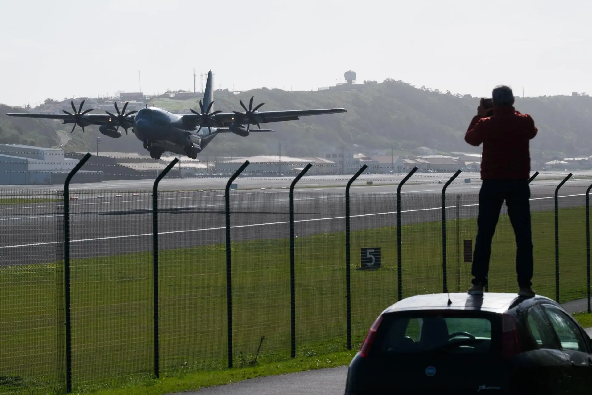 Numa pacata manhã de sol na ilha Terceira, alguns curiosos registaram a partida do C-130 com telemóveis, do outro lado da vedação, mas não havia muito movimento à volta da infraestrutura.