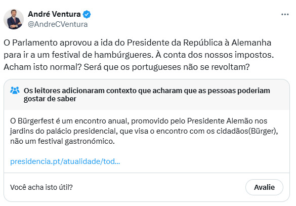 A resposta surge depois de Ventura ter criticado o Parlamento por aprovar a ida do presidente da República à "Bürgerfest", afirmando que se tratava de um "festival de hambúrgueres". "O Parlamento aprovou a ida do presidente da República à Alemanha para ir a um festival de hambúrgueres. À conta dos nossos impostos. Acham isto normal? Será que os portugueses não se revoltam?", escreveu o líder do Chega na rede social X.