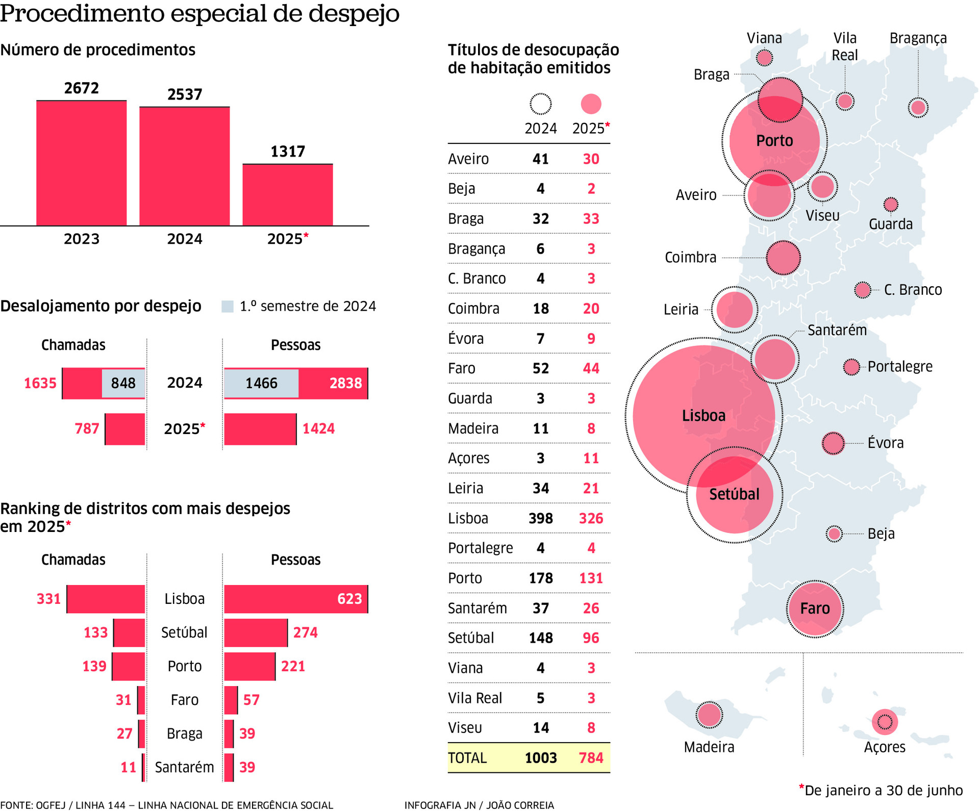 Entre janeiro e junho de 2025, houve uma média mensal de 130 despejos, número que supera todo o ano de 2024, com 83 casos, e de 2023, com 89 situações, de acordo com dados facultados ao JN pelo Ministério da Justiça. O incumprimento do pagamento da renda é a principal causa, mas as associações de inquilinos denunciam pressões diárias dos senhorios para os arrendatários, sobretudo idosos, entregarem as casas, para as poderem rentabilizar. Lisboa, Porto e Setúbal são os distritos onde há mais despejos.