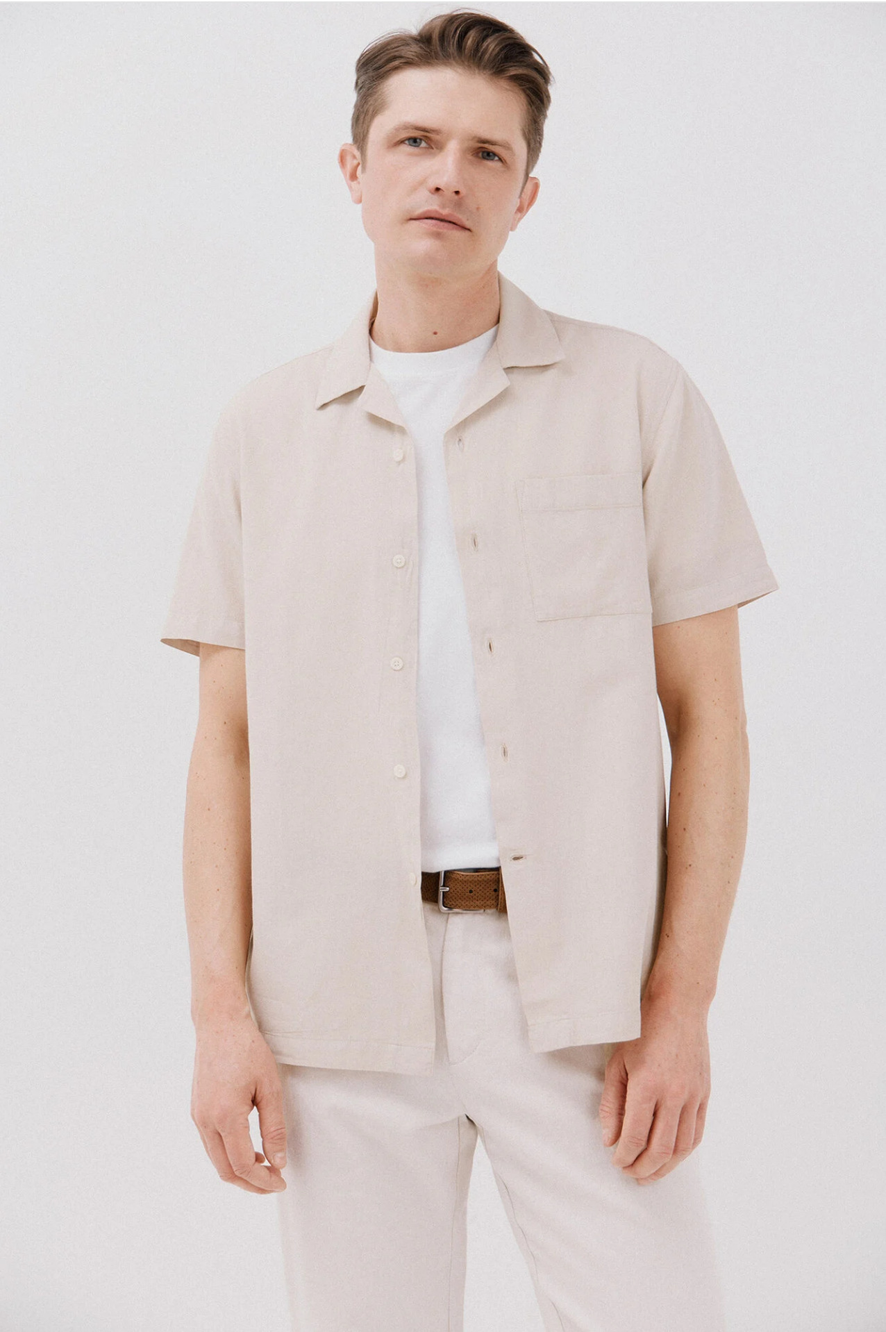 Quanto a estilos, o verão convida à ousadia com camisas de manga curta em padrões tropicais, florais suaves ou riscas verticais. As golas abertas ao estilo cubano voltam a marcar presença, conferindo um toque retrochique que resulta tanto com calções como com calças. Para quem prefere um visual mais clássico, as cores neutras como branco, areia, azul-claro ou verde-sálvia continuam a ser apostas seguras e fáceis de combinar.