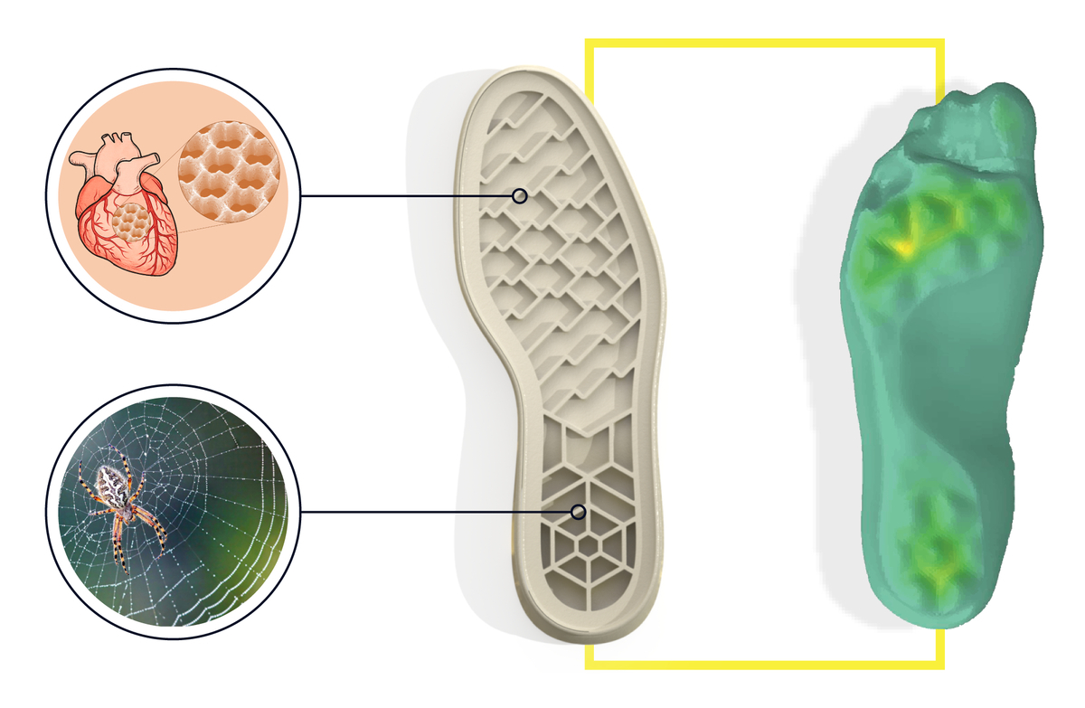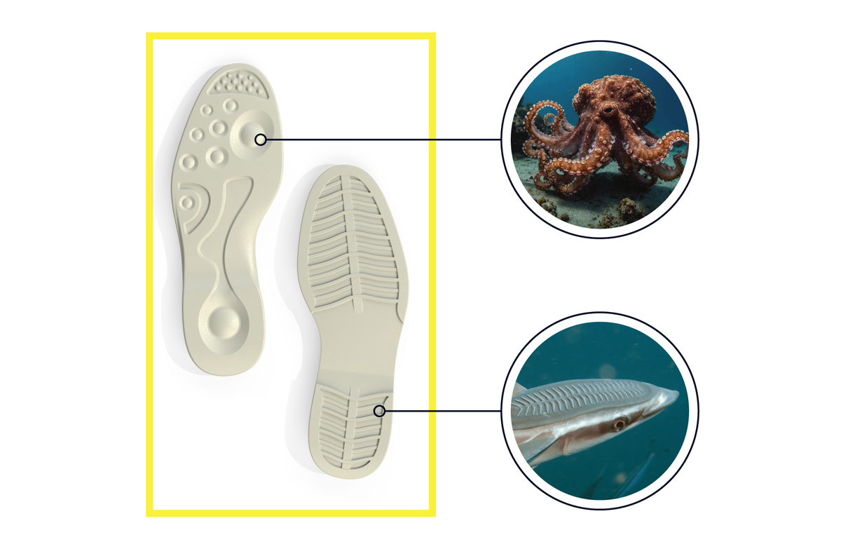 O novo produto foi desenvolvido tendo em vista "princípios biomiméticos, ou seja, recorrer a funções que existem na Natureza e mimetizá-las para melhorar aspetos de desempenho", conta Clara Gonçalves, gestora do projeto no PIEP, em Guimarães. O ato de aprender com a Natureza para "resolver desafios humanos", não é novidade para os investigadores do PIEP, que o voltaram a utilizar como "ponto de partida para mais esta inovação, que alia ciência, tecnologia e sustentabilidade em benefício do utilizador e do ambiente", acrescenta Bruno Pereira da Silva, diretor de relações públicas e sustentabilidade do Polo. Por isso, não é difícil reconhecer nas solas estruturas do coração humano, da teia de aranha e das ventosas do polvo.