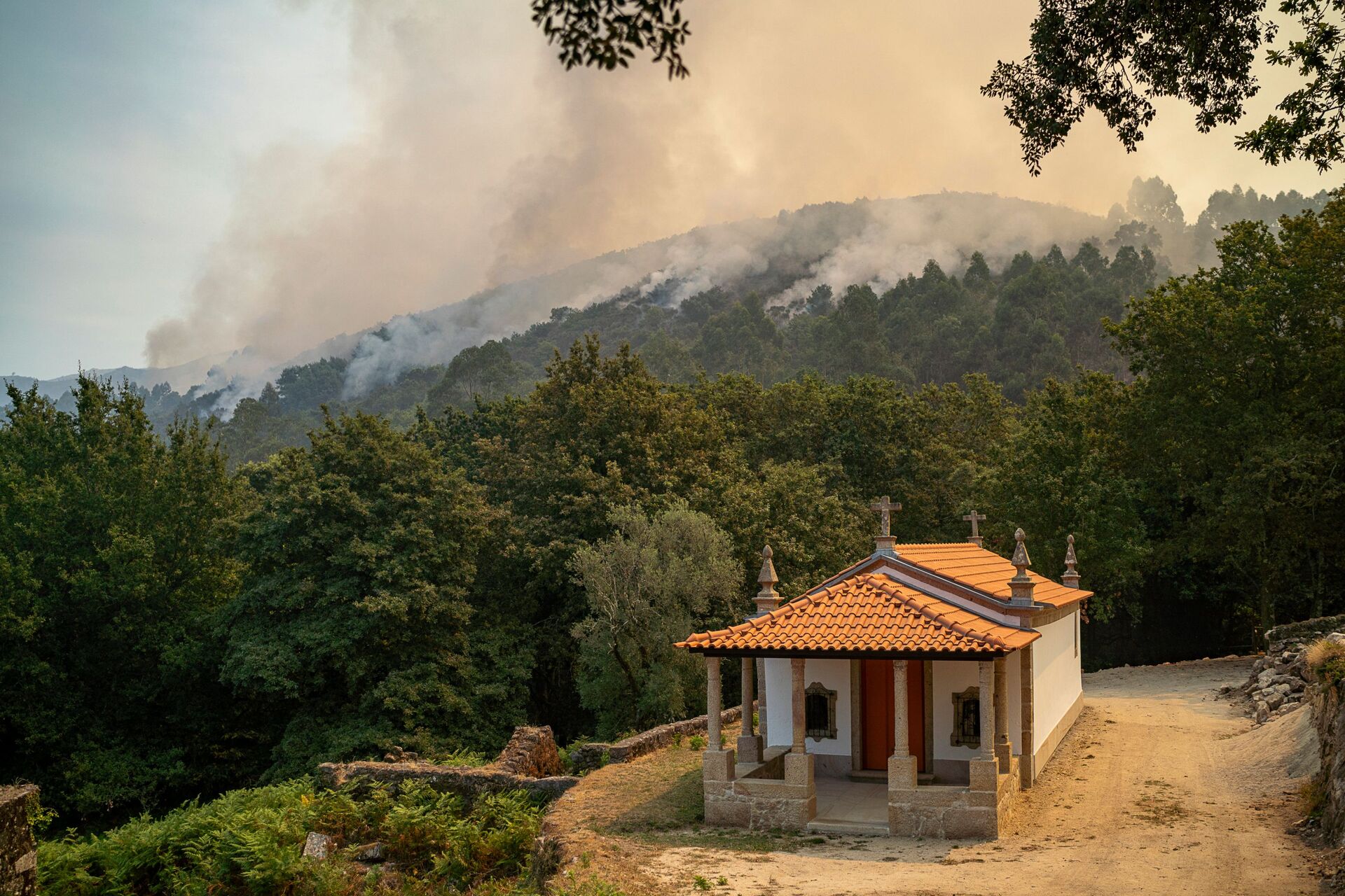 José e Jacinta Silva estacionaram, esta quarta-feira, o carro junto à capela de S. João, na Facha, Ponte de Lima, um dos pontos de onde se aproximava o incêndio que lavra há dois dias naquele concelho. Jacinta é dona, com outros familiares, de um pinhal e eucaliptal com 10 hectares naquela zona, que o fogo praticamente já destruiu na totalidade.