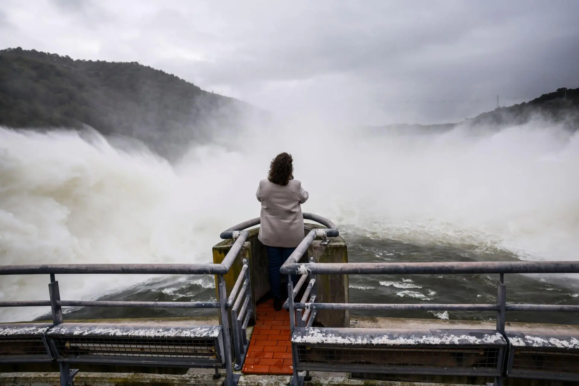 Na primeira vez que assistiu ao espetáculo da água a jorrar do enorme paredão da barragem, estavam "abertas as comportas de superfície", mas, desta vez, a água sai a grande velocidade pelos descarregadores de meio fundo.