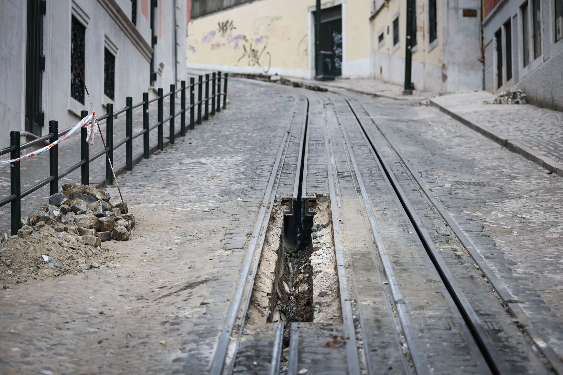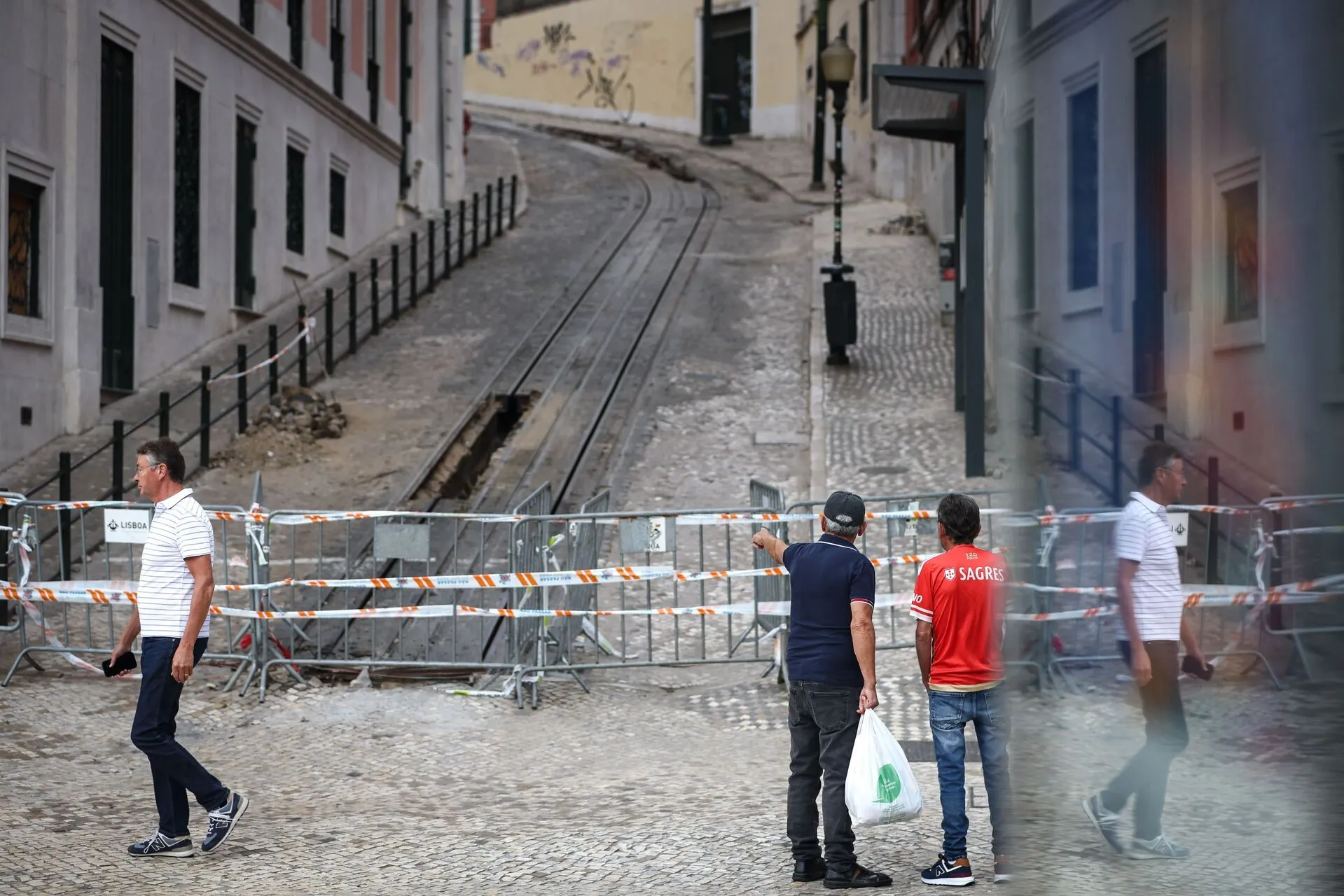 As baias da Câmara Municipal de Lisboa e as fitas de segurança da Polícia Municipal e Proteção Civil delimitam agora a base da Calçada da Glória, impedindo a passagem.