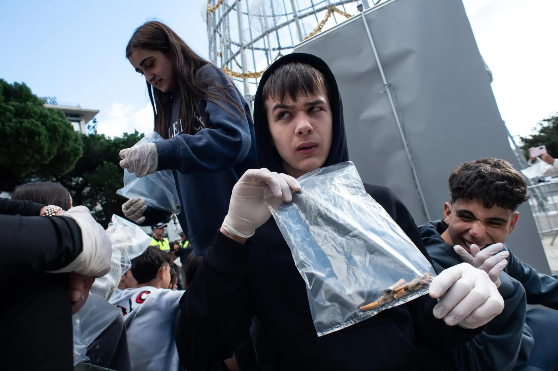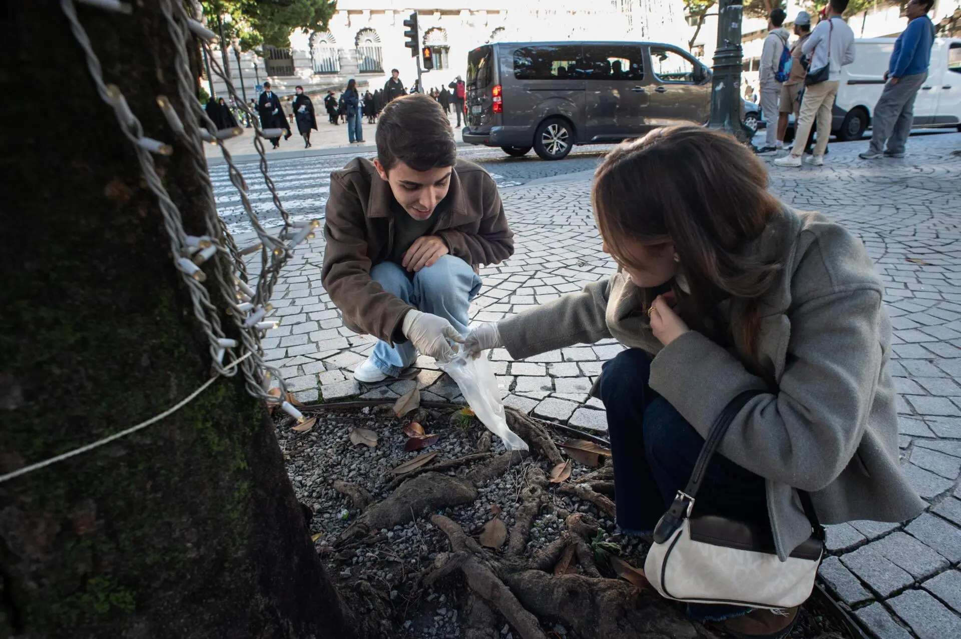 A agente da Polícia Municipal (PM) Paula Alves, que, junto com David, vai guiando este grupo, explica aos estudantes que as beatas de cigarro "são o lixo mais descartado do mundo" e que se estima que sejam descartadas anualmente cerca de cinco biliões. "São mesmo um desastre habitual", garante, enquanto também se vai baixando para os ajudar na recolha.