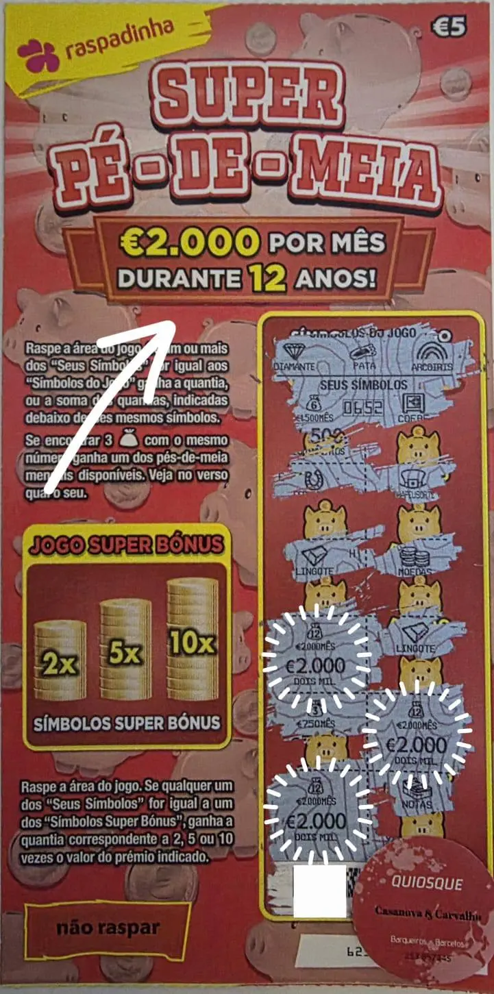 Um homem ganhou 288 mil euros numa raspadinha Super Pé-de-Meia, o equivalente a dois mil euros por mês durante 12 anos. O prémio saiu a um cliente habitual do quiosque Casanova e Carvalho, em Barqueiros, Barcelos, que se deslocou ao espaço para comprar tabaco e decidiu tentar a sorte com uma raspadinha de cinco euros.
