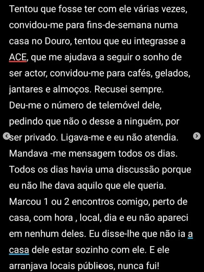 "Tantas vezes estive eu, horas à espera, em frente à sala da direção da ACE para falar dos tais 'comportamentos anómalos'", revela uma outra pessoa à página, indicando que tentou falar com uma professora que lhe disse que eram "coisas da cabeça" dela e que Capelo tinha "reputação" na escola.