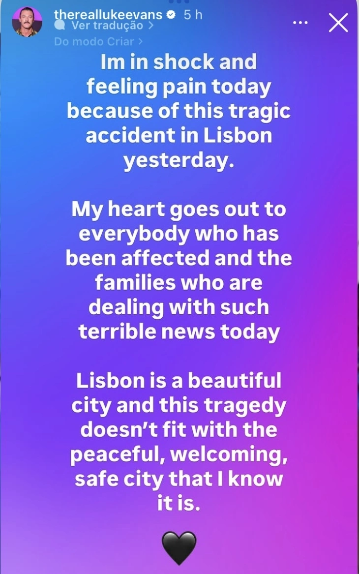 Numa história partilhada no Instagram, Evans escreveu: "Estou em choque e a sentir dor hoje por causa deste trágico acidente em Lisboa ontem. O meu coração está com todos os que foram afetados e com as famílias que estão a lidar com notícias tão terríveis hoje."