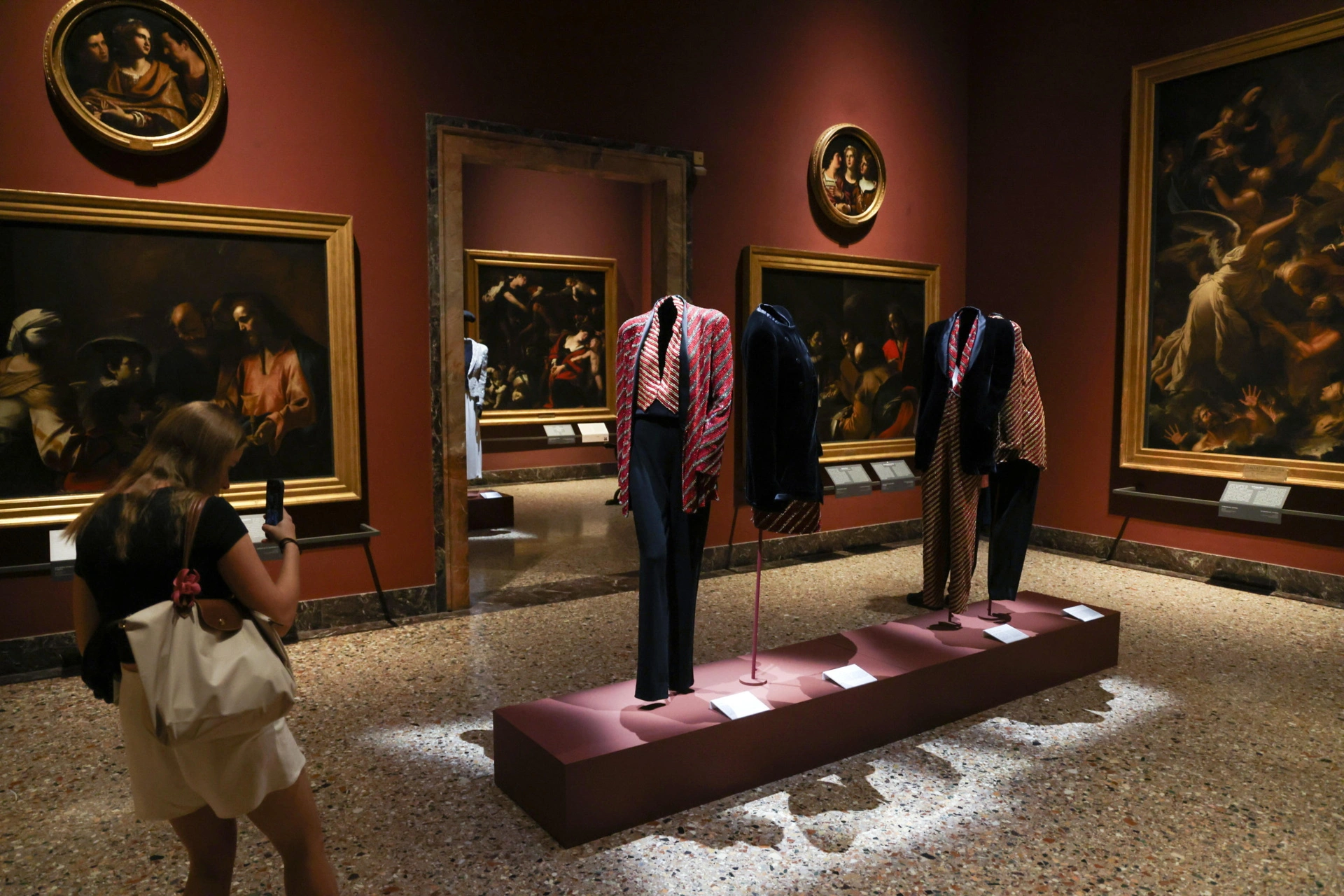 Entre os momentos mais emocionantes, destacam-se peças que refletem cores e formas das obras expostas, como a saia azul usada por Juliette Binoche em Cannes, que ecoa o tom da "Madonna and Child" de Giovanni Bellini. A exposição abre com um vestido azul-escuro de veludo, com painéis bordados, colocado na capela do museu, em perfeita sintonia com o ambiente.