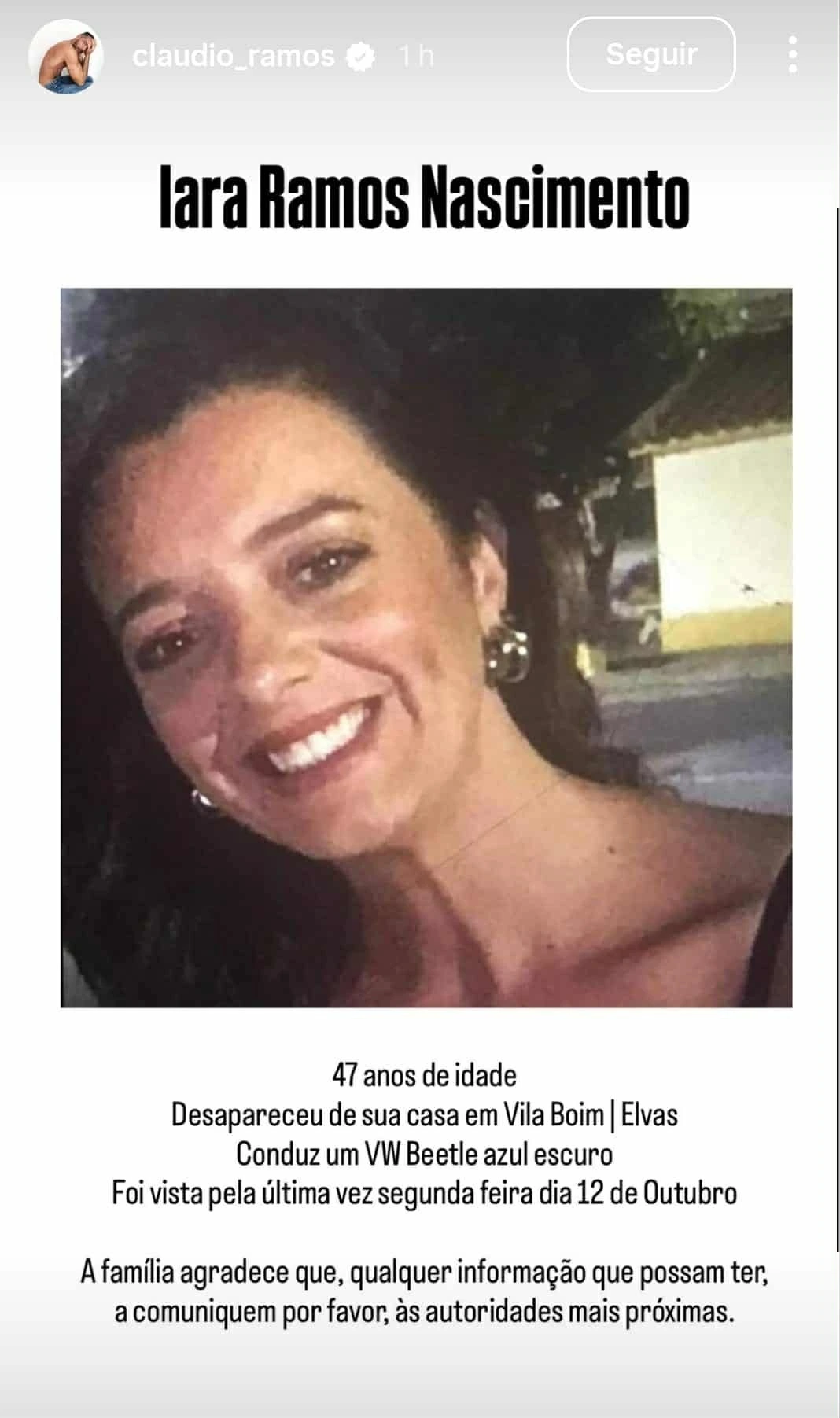 A irmã do apresentador de televisão Cláudio Ramos, Iara Ramos Nascimento, de 47 anos, está desaparecida desde o dia 12 de outubro. A notícia foi avançada nas redes sociais pelo próprio apresentador, num apelo aos cidadãos.