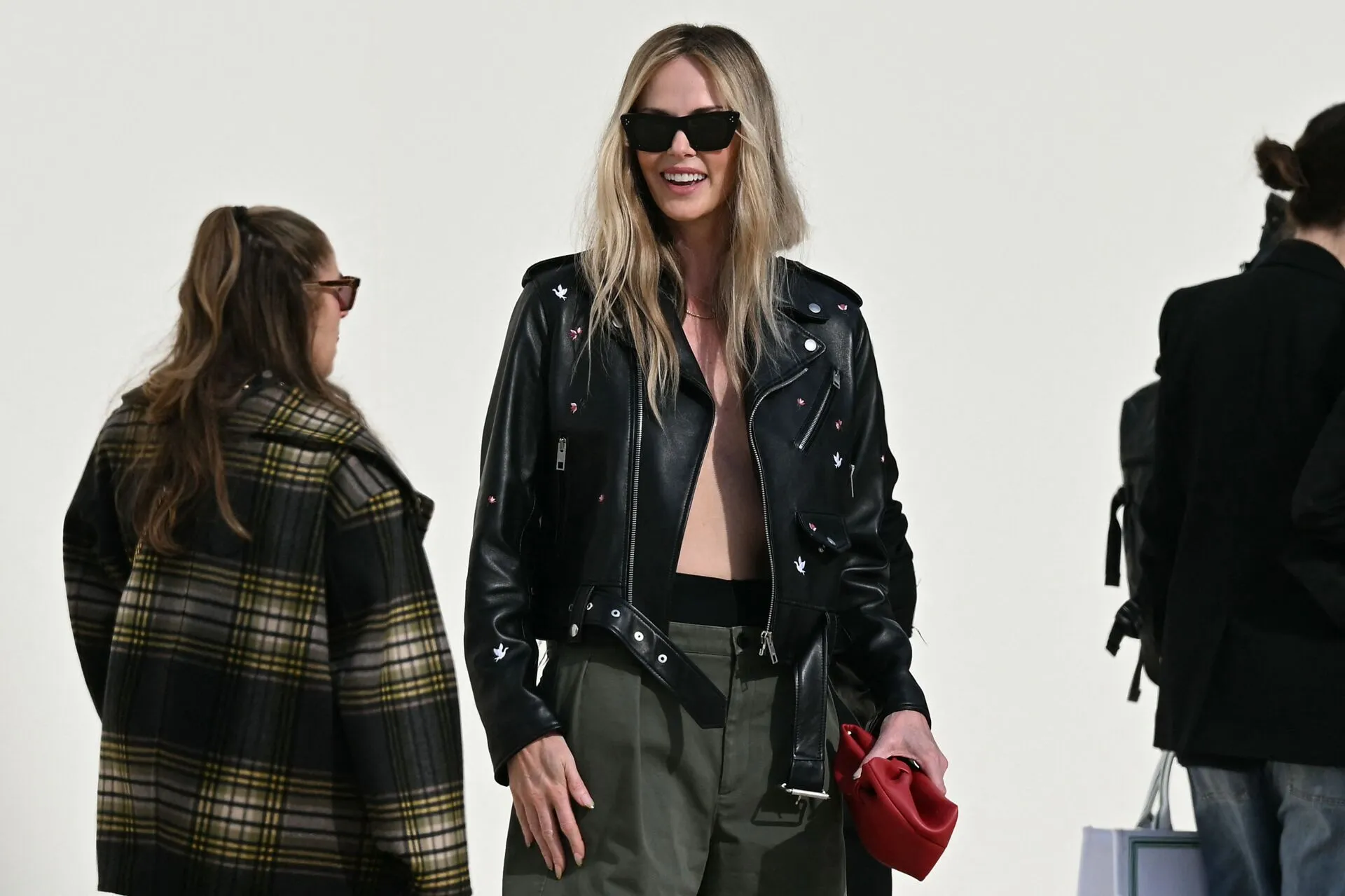 Theron destacou-se com um conjunto descontraído e arrojado: jaqueta biker de pele preta, usada sem nada por baixo, calções caqui, collants transparentes e mules brancas. Com cabelo solto em ondas e clutch vermelha, mostrou uma confiança que definiu o tom da noite.