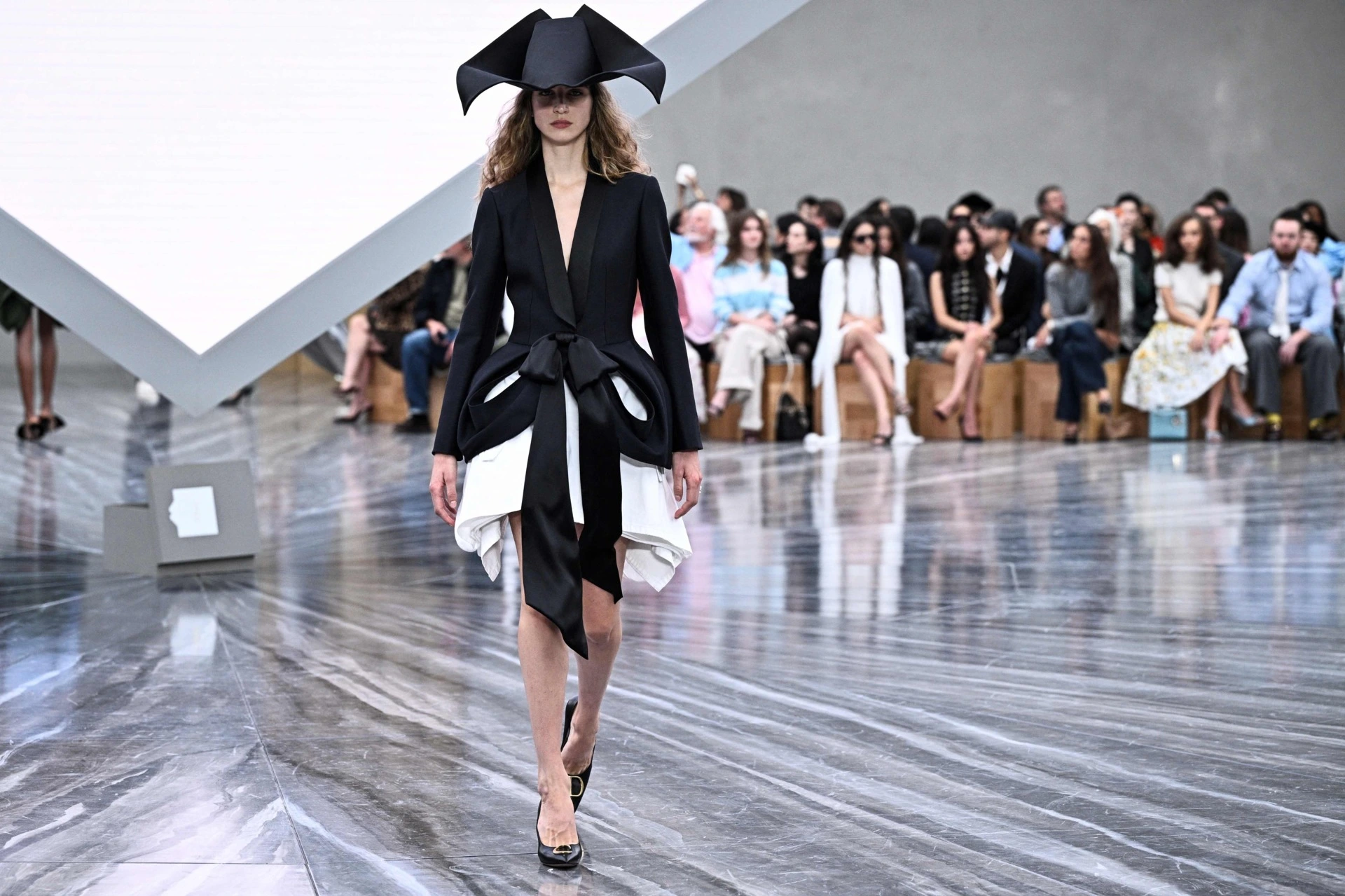 O desfile começou de forma cinematográfica: uma pirâmide invertida gigante, evocando a do Louvre, projetou imagens de arquivo da Dior, antes de revelar uma coleção marcada por contrastes. Grandes laços pretos e rendas delicadas surgiram lado a lado com blusas de ganga e minissaias cargo, enquanto vestidos volumosos evocavam o século XVIII.