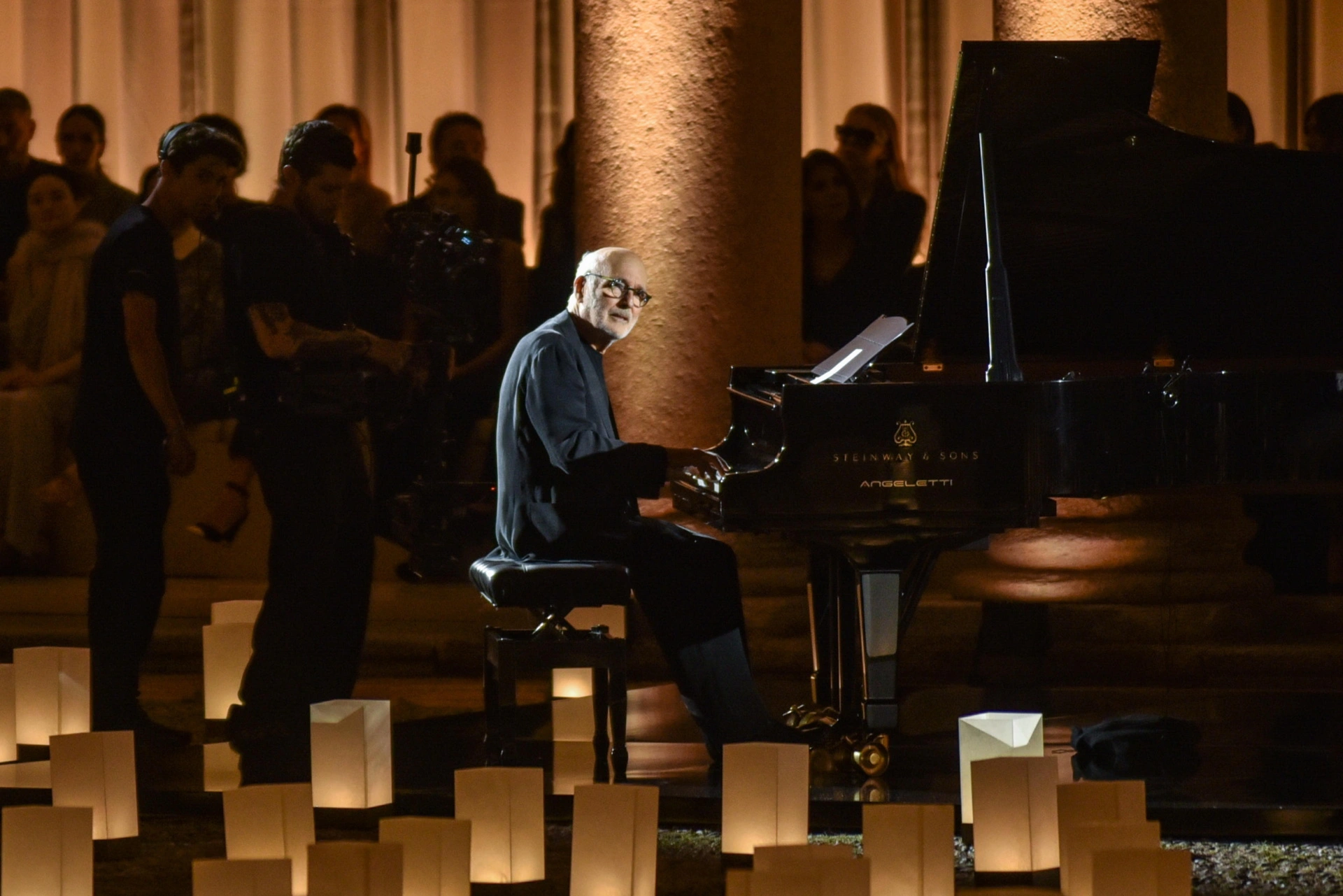 A música ao vivo do pianista Ludovico Einaudi conferiu um tom solene e intimista à noite, enquanto cada passo na passarela parecia homenagear a presença de Armani.